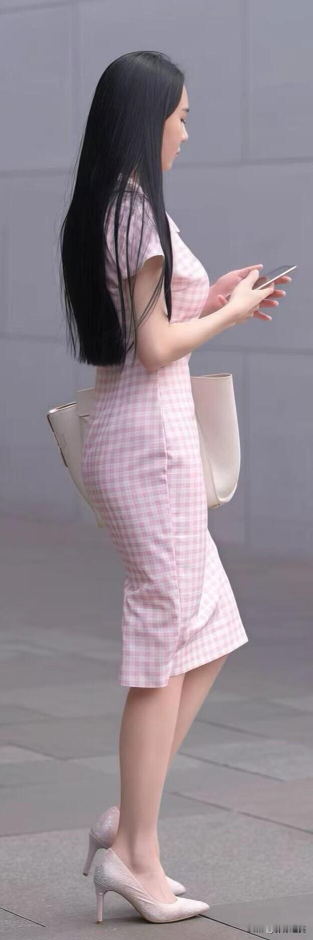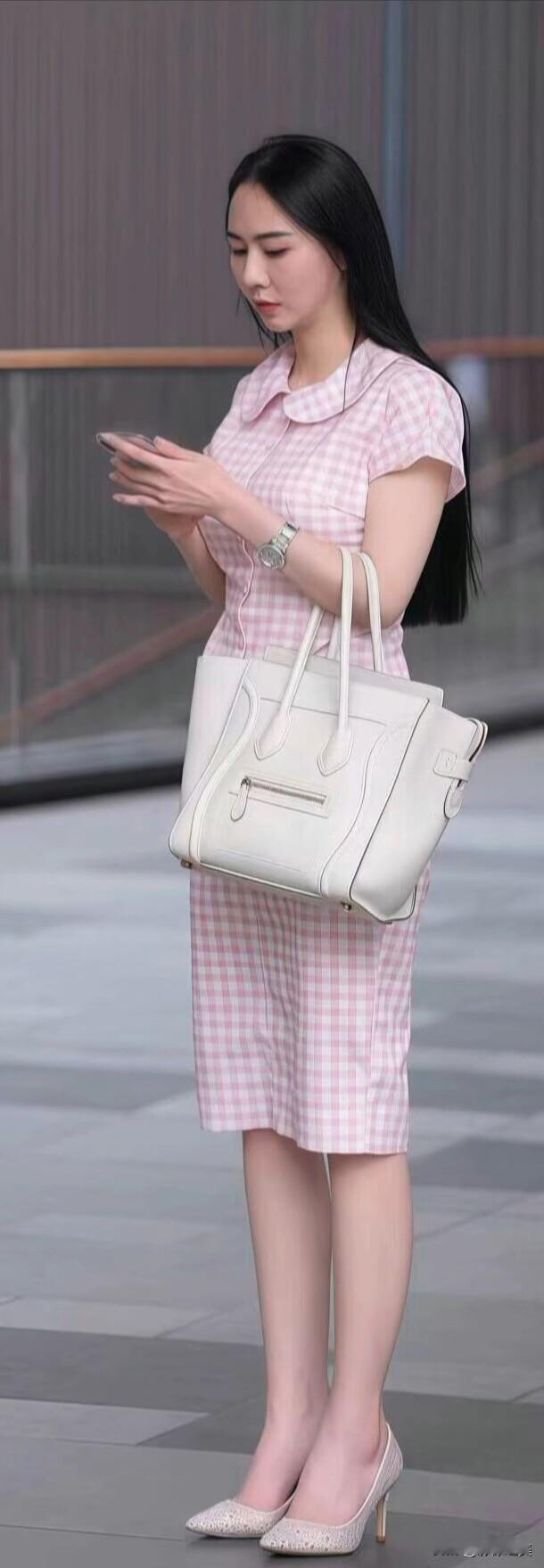 粉白格纹连衣裙自带清甜感,娃娃领减龄又温柔,搭配简约白包和高跟鞋,漫步街头的样子,把优雅和少女感平衡得刚刚好。