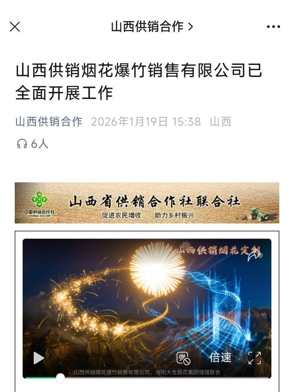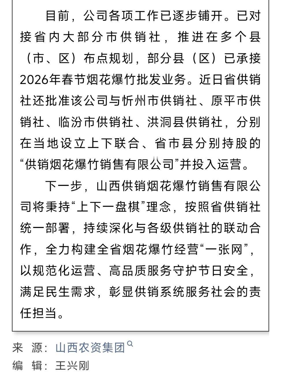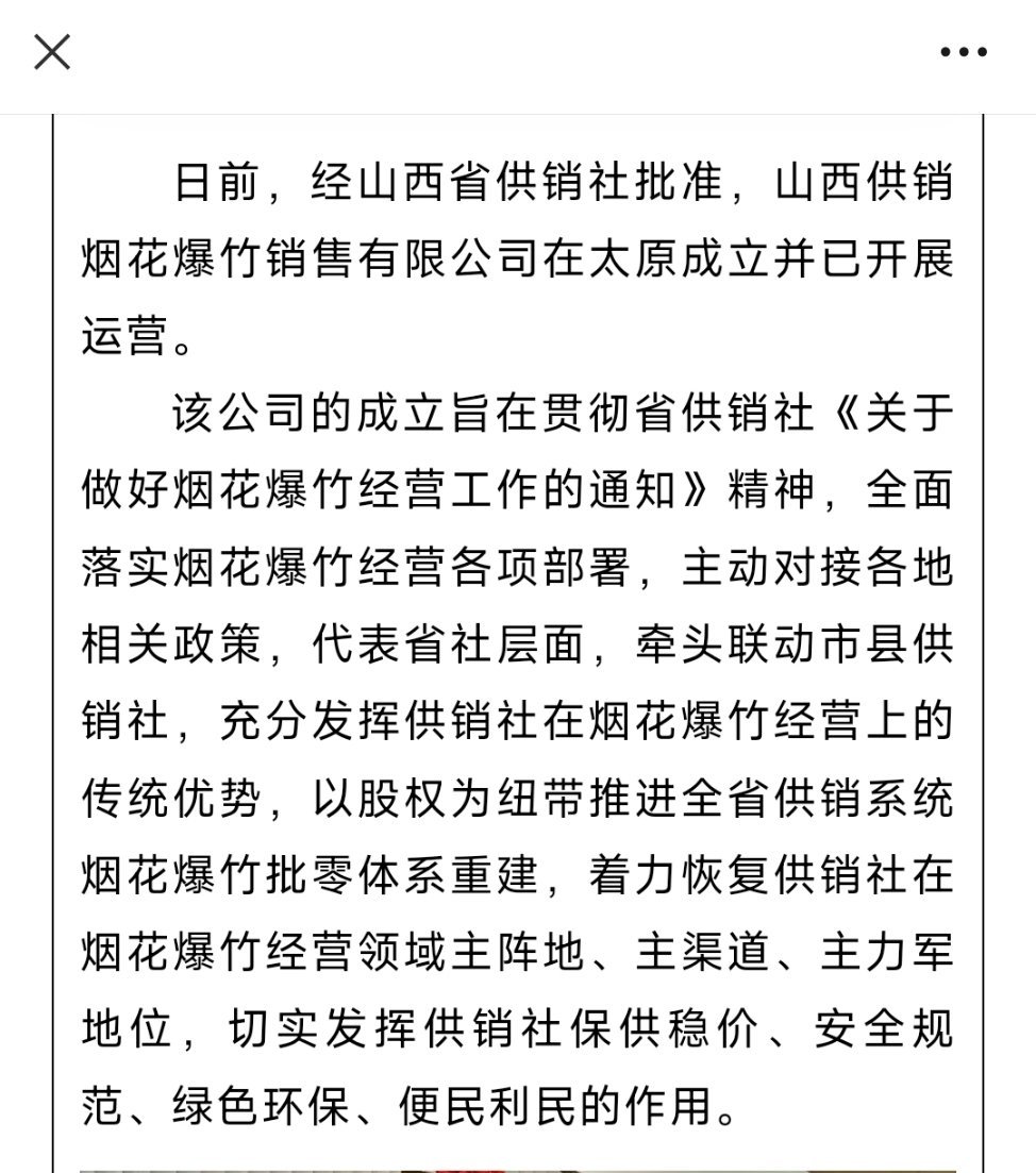 日前,经山西省供销社批准,山西供销烟花爆竹销售有限公司在太原成立并已开展运营。 该公司的成立旨在贯彻省供销社《关于做好烟花爆竹经营工作的通知》精神,全面落实烟花爆竹经营各项部署,主动对接各地相关政策,代表省社层面,牵头联动市县供销社,充分发挥供销社在烟花爆竹经营上的传统优势,以股权为纽带推进全省供销系统烟花爆竹批零体系重建,着力恢复供销社在烟花爆竹经营领域主阵地、主渠道、主力军地位,切实发挥供销社保供稳价、安全规范、绿色环保、便民利民的作用。