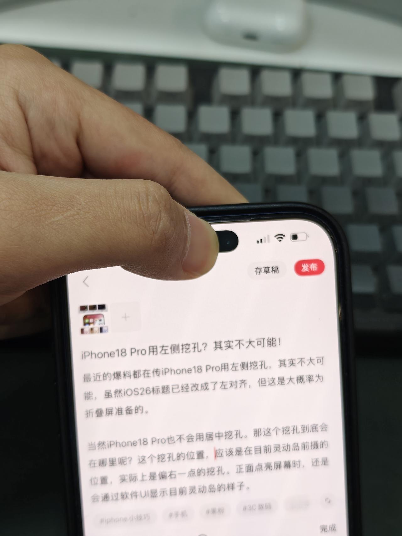 最近的爆料都在传iPhone18 Pro用左侧挖孔,其实不大可能,虽然iOS26标题已经改成了左对齐,但这是大概率为折叠屏准备的。[灵光一闪] 当然iPhone18 Pro也不会用居中挖孔。那这个挖孔到底会在哪里呢?这个挖孔的位置,应该是在目前灵动岛前摄的位置,实际上是偏右一点的挖孔,就是图2我手指挡住FaceID组件的位置。正面点亮屏幕时,还是会通过软件UI显示目前灵动岛的样子。你们喜欢这种设计吗?