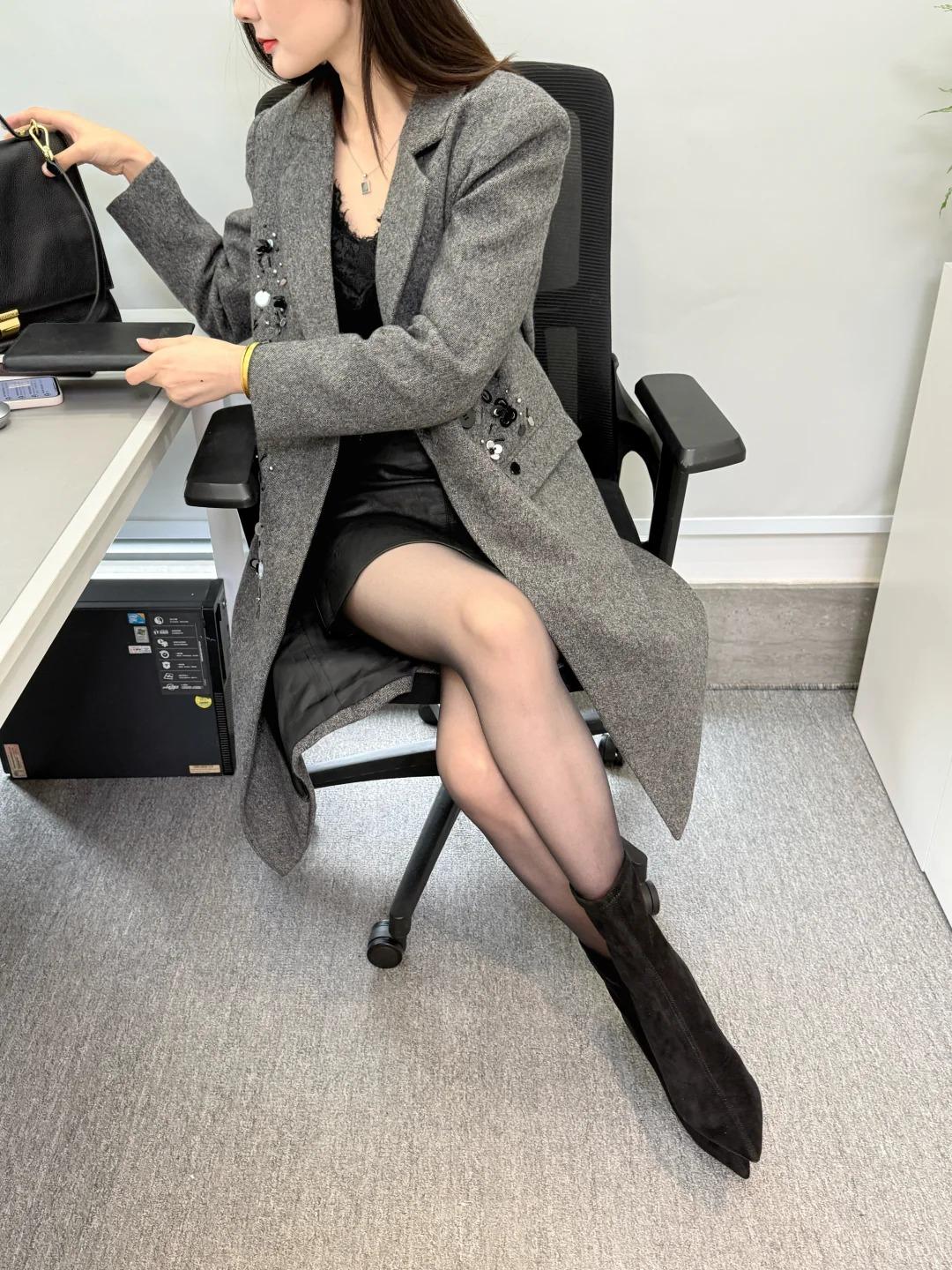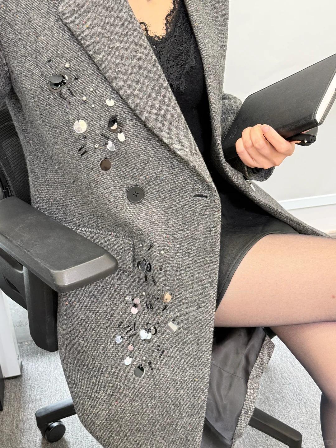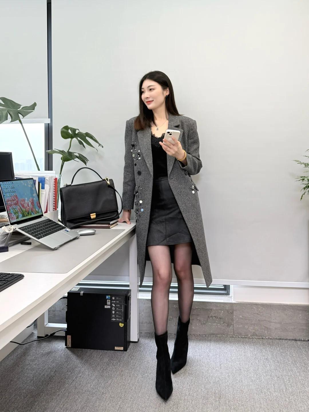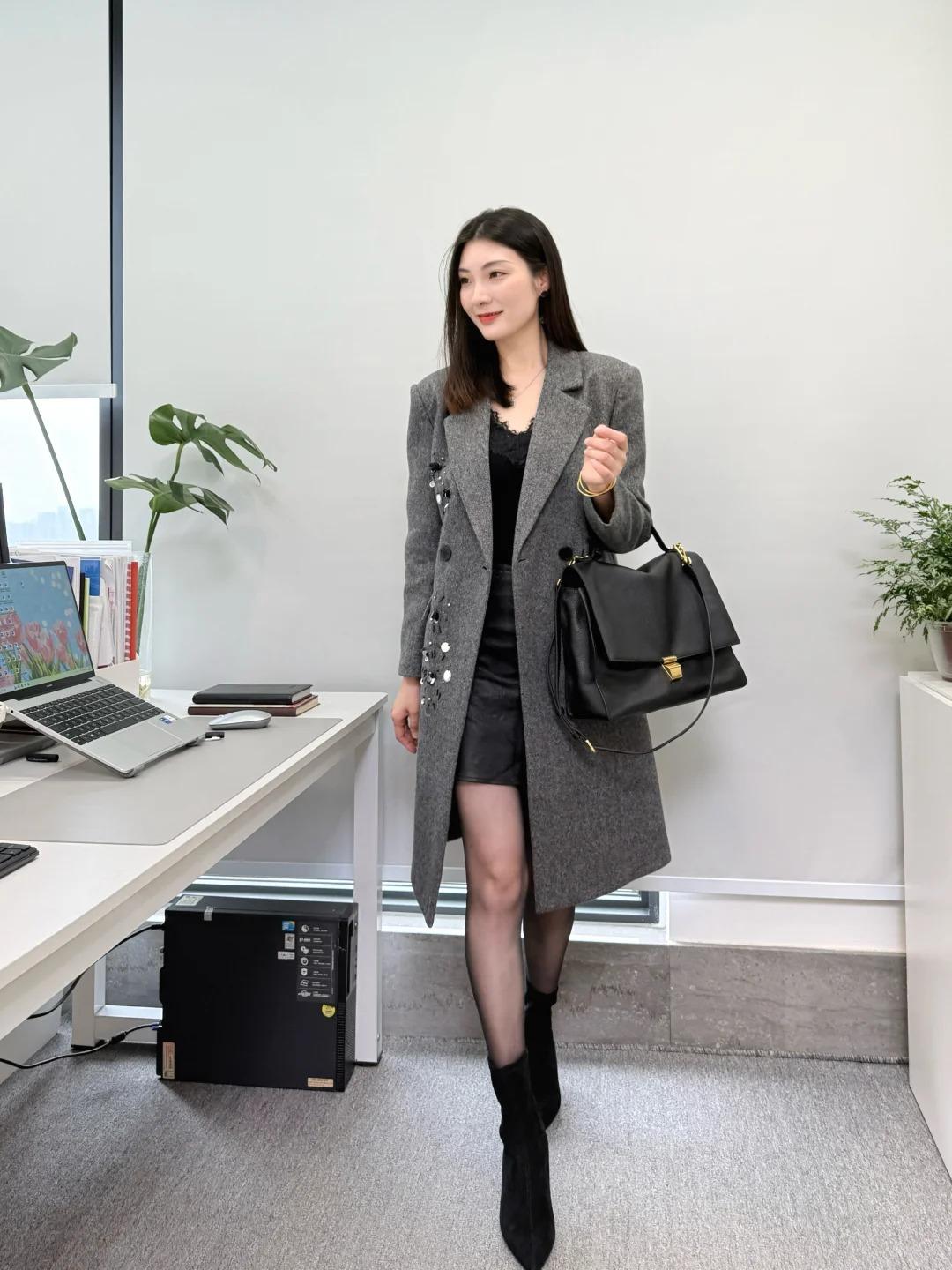 灰色大衣真的是秋冬质感天花板!利落挺括的版型自带高级滤镜,不臃肿还能巧妙修饰身形,内搭黑色短裙更是点睛之笔。 短裙拉高腰线,把身材比例衬得绝了,黑白经典配色简约又大气,显瘦效果直接拉满,走路带风的同时又不失女性柔美。 职场干练与优雅气质完美融合,简单的单品却穿出了独有的格调,妥妥的行走穿搭模板!谁懂啊,这样又美又有气场的领导真的太吸睛了~