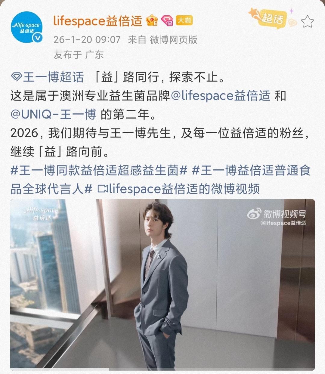 续约续约!王一博又一个代言品牌续约啦👏🏻 「益」路同行,探索不止。 澳洲专业益生菌品牌lifespace益倍适和王一博携手开启第二年,继续一路同行✌🏻。 王一博商业价值,没有人比业内和品牌方更清楚,30+的断层代言数量、质量和一骑绝尘的续签率足以说明一切。 王一博