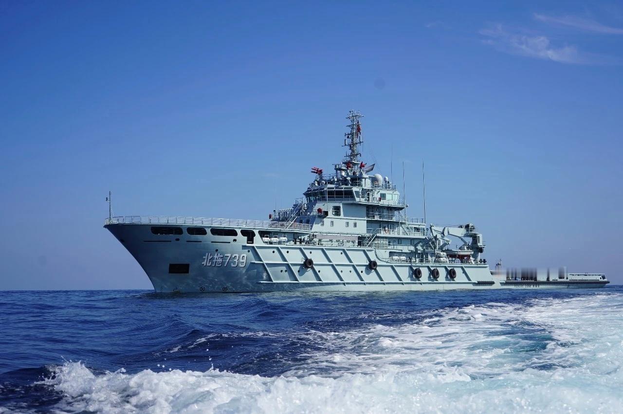 2017年入列的海军首艘19000马力第三代远海救助拖船,北部战区海军北拖739船。该船全长110余米,型宽16米,最大排水量6000余吨,自持力30天。该船以大、中型舰船保障为重点,以承担海上救助、拖带任务为主,兼顾海上应急搜救、应急抢修、消防灭火、协助潜救、装备维修、备件供应及搭载模块化装备等任务,是海军目前吨位最大、拖力最大的拖船和对外消防能力最强的辅助船。图9,北拖739船拖带16辽宁舰烽火问鼎计划每天认识一件兵器台海局势