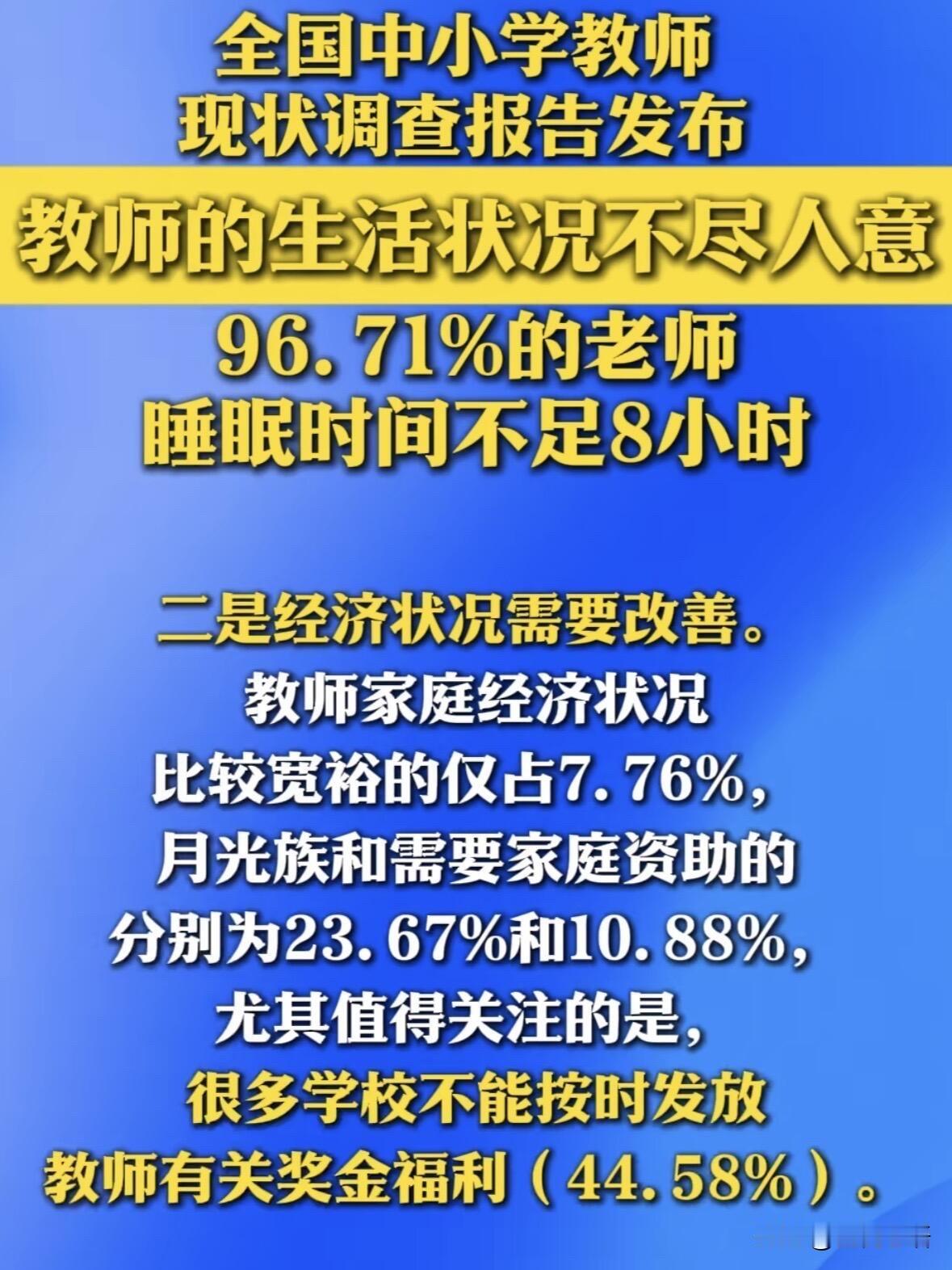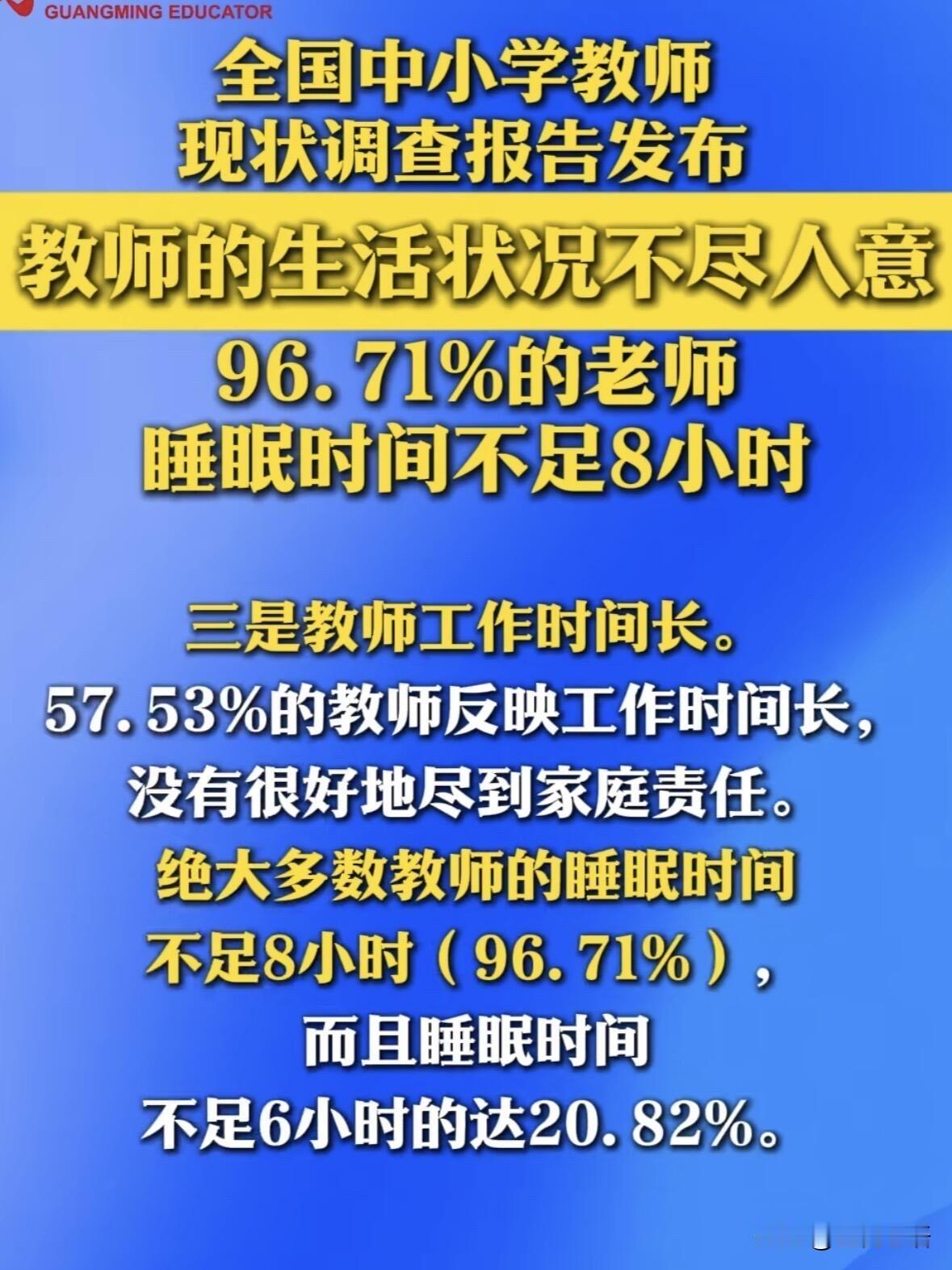 看到中小学教师现状报告,真的破防了! 96.71%的老师睡不够8小时, 近六成工作时间超长。 钱没挣多少, 44%的学校不按时发福利, 不少老师还得靠家里补贴。 更扎心的是不被尊重信任, 表面客气背后疏离。 老师又要管教学又要顾学生, 身心俱疲快被掏空。 别只喊着尊师重教, 多给点实际关怀吧! 希望老师们能少点压力,睡个安稳觉~