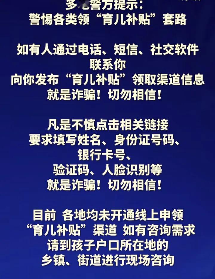 瞄准2026婴儿补贴!骗子连环下套,3招教你守住养娃钱 刚收到“2026婴儿补贴申领通知”?别急着点链接!官方通知只会通过政务平台、社区街道办送达,主动短信轰炸、境外来电推送的,全是骗子的陷阱!你以为是国家发的“奶粉钱”福利,实则是骗子从2025年11月就布下的连环套!四川、江苏、陕西已有上百位宝妈中招,有人刚到手的生育津贴全被骗光,有人还背上了网贷——这骗局专挑新手爸妈下手,套路一环扣一环,稍不留神就中招! 广东佛冈的杨女士,至今想起来还后背发凉。2026年1月10日下午,她接到一通“政府工作人员”的来电,对方不仅能准确报出她的姓名、宝宝出生日期,甚至连户籍地址都分毫不差,开口就说“你申请的3600元育儿补贴发放异常,今晚12点前不处理就自动作废”。 养娃压力本就大,白给的补贴哪舍得丢?杨女士瞬间慌了神,赶紧按对方指引操作。可刚绑定完农村信用合作社账户,对方又说“非四大银行无法到账”,催着她换绑常用银行卡。更诡异的是,绑定后杨女士发现自己的卡转不出钱,对方竟然让她去借钱“激活账户”——这一句话,让她猛然惊醒:不对劲! 她立刻挂掉电话报警,民警迅速启动止付机制,两天后成功追回险些被骗的9994.41元。你以为这就是全部?更狠的还在后面!四川大英县的张女士,没这么幸运。2025年12月3日,她收到“点击领补贴+2罐奶粉”的短信后,按要求填了宝宝出生证明信息,还被诱导“刷单5单解锁补贴”,小额返利后越投越多,最后累计被骗4万元,直到客服失联才发现上当。 最让人细思极恐的是,骗子的套路早已升级!他们不再是粗糙的钓鱼链接,而是制作高仿“国家政务服务平台”的网站,页面飘着官方标识,连弹窗都写着“政务服务便民利民”,让人根本分不清真假。更绝的是“连环回访”:你填完信息后,会接到第二通“技术人员”来电,用专业术语解释“账户风控”,再轻描淡写要短信验证码,一旦给出,卡内资金瞬间被转走。 你以为只有主动点链接才会中招?错!陕西西安的吴女士,2026年1月12日只是在宝妈群里看到“补贴最后3天申领”的通知,随手填了信息,就被骗子以“信息核验”为由骗走5000余元。骗子甚至会诱导你下载陌生APP,开启屏幕共享,远程操控你的手机转钱,全程你都懵懵懂懂! 看到这是不是头皮发麻?其实骗子的套路再绕,也逃不过这3个核心陷阱,记住这3招,直接让骗局终结: 1. 官方渠道只认“自己找”:补贴申领只能通过支付宝/微信“育儿补贴”小程序、户籍地政务平台或线下街道办,主动找上门的全是骗子; 2. 验证码是“救命符”:不管对方说“核验信息”还是“激活账户”,只要要验证码,立刻挂电话,正规部门绝不会要这个; 3. 遇“加急/代办/刷单”直接拉黑:惠民政策没有“捷径”,要交钱、要刷单才能领的,全是诈骗。 你或身边人接到过类似补贴诈骗电话吗?如果收到“限时领育儿补贴”的通知,你会先核实还是直接操作? 警方提示 2026育儿补贴防骗 守护奶粉钱 信息来源:新华网、新清远、公安部网安局 网络截图