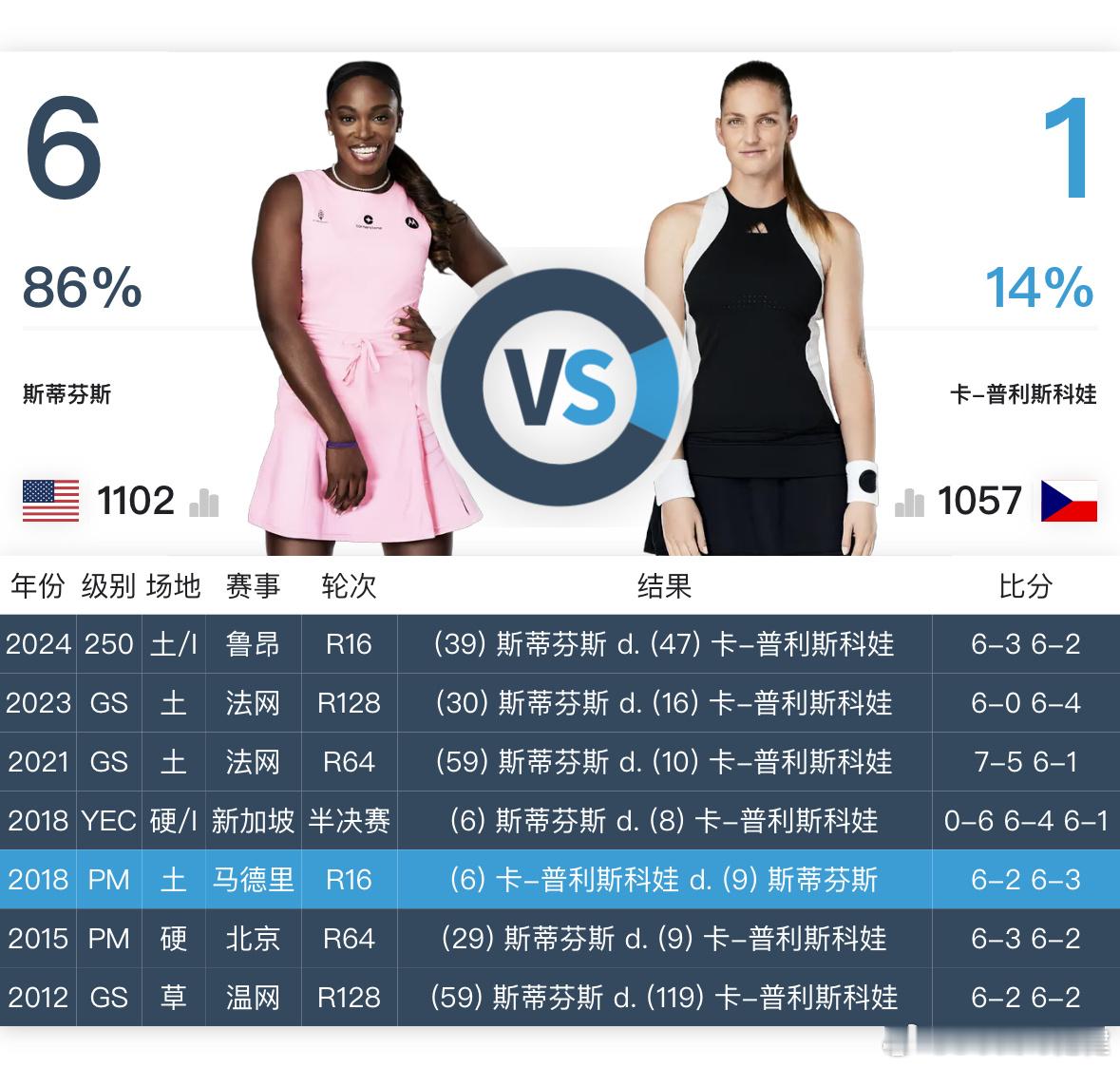 No.1057VSNo.1102今夕是何年!卡-普利斯科娃7-6/6-2击败大主人斯蒂芬斯,终结对其四连败!继2024美网后再取大满贯/巡回赛胜利!继2023澳网击败张帅后再度在这里取胜!这很澳网澳网2026