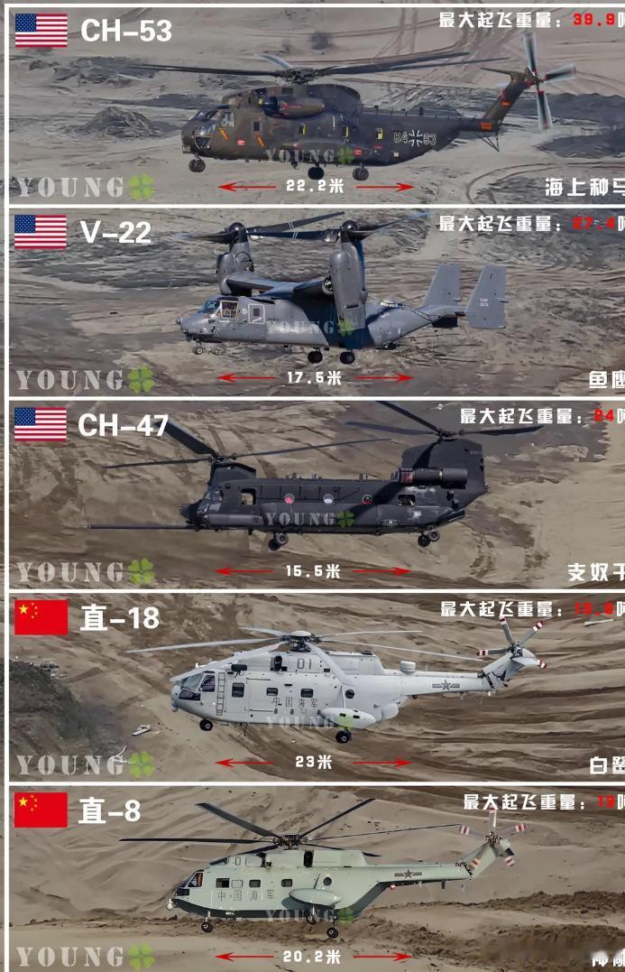 在军用重型直升机方面,我们还是和美国存在有不小的差距! 我们国家目前国产最大的直升机是“直18”,最大起飞重量才18吨? 而美国无论是轻型、中型还是重型直升机都是性能非常优秀的直升飞机。 尤其是美国海军的“种马王”超重型直升机已经达到了世界先进水平。 中国直升机