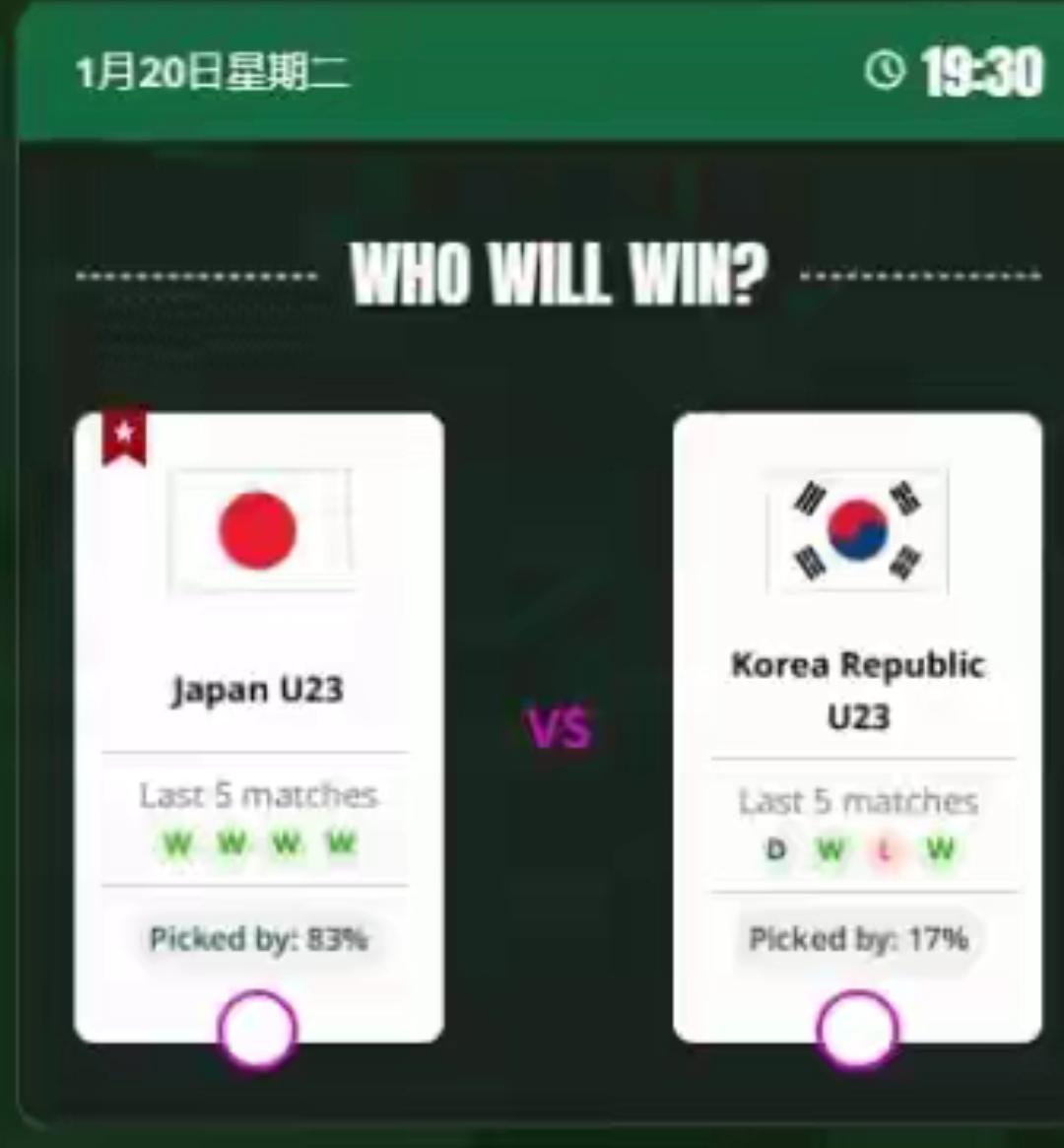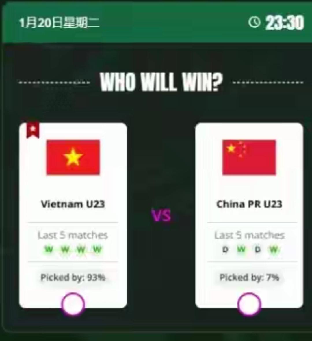 太好啦!网上投票越南队获胜支持率高得离谱,越南🇻🇳胜高居93%,中国胜🇨🇳才7%,看到这个数据心里更放心了,一边倒,这样买越南胜的会相当多,这样中国队反而才会拿下胜利,何况越南U23历史上正赛中从来没有战胜过中国U23,中国队加油!从图旗看也是中国胜,越南1颗星对我们五颗星,一目了然。 另一场半决赛:网上投票日本获胜支持率高居83%,韩国🇰🇷胜才17%,日本和韩国19:30率先开战,鹿死谁手,让我们拭目以待吧!大家希望中国队决赛对谁?对日本还是韩国?欢迎大家交流讨论?