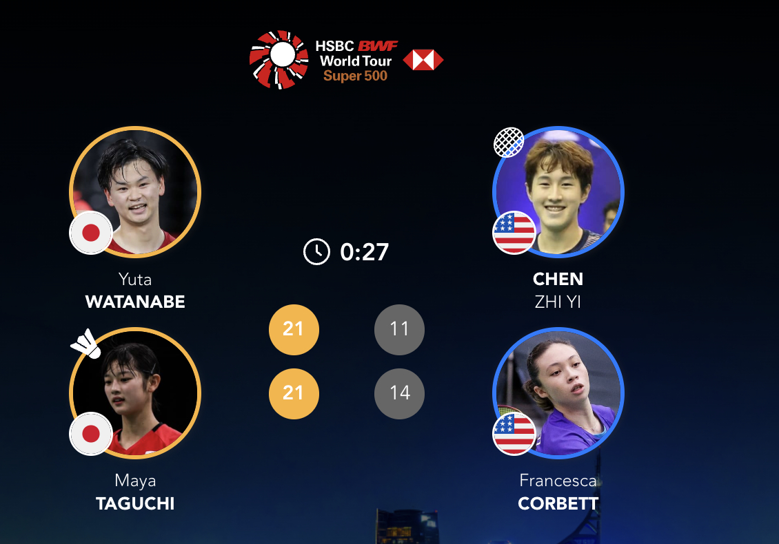 渡边勇大/田口真彩🇯🇵 21-11、21-14 🇺🇸陈子亦/弗朗西斯卡正赛:渡边勇大/田口真彩🇯🇵 vs 🇺🇸普雷斯利/珍妮·盖2026年印尼羽毛球大师赛
