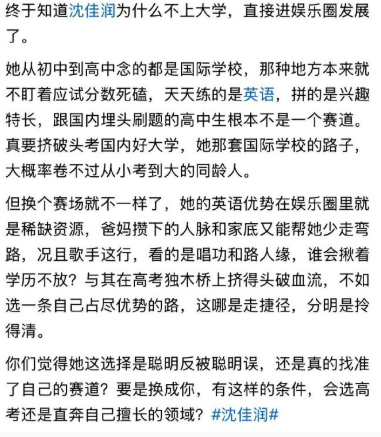 网友分析的沈佳润为什么不上大学,直接进娱乐圈发展的原因