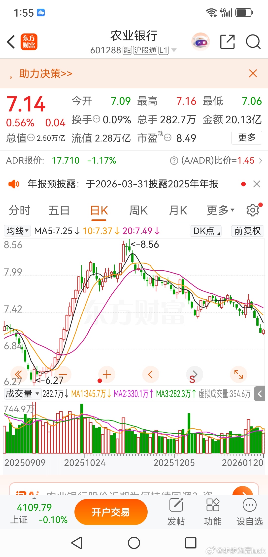 农业银行,倒车接人昨天有群友问,农业银行连续下跌破位走势该怎么处理?言下之意,就是要不要止损。很多人因为害怕个股的风险而买入农业银行,但是又以炒个股的心态去看待要求农业银行,这个是典型的既要又要的心态。对于趋势,我一向认为有两种,一种是短期趋势、一种是长期趋势。短期趋势是由市场风格决定的,长期趋势是由公司质地决定的,很显然目前的农业银行短期趋势是空、长期趋势是多。这种长期上涨的股票,买点一定是在让人难受的阶段产生的,如果你长期趋势看多,那么现在就是一个很好的上车机会。难看买、好看卖,这才是长期价值投资品种的买卖之道,农行这一波接近20%的回调,就是一次很好的倒车接人。对于农业银行这样的长期价值投资的股票,你要上车就是长期持有,来玩短线纯属自讨没趣。欢迎加入我们的免费交流群财经股票