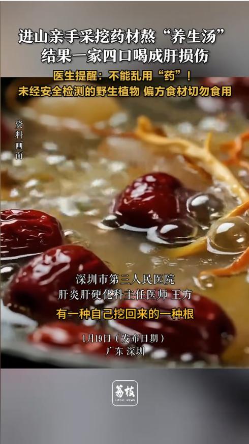 “悲剧还是发生了!”近日,广东,一男子听说山上的油甘树根能补气血,特意挖了一大捆回家煲“养生汤”,想着给一家四口补补身子。结果汤刚喝完半小时,全家人就开始上吐下泻,直接被救护车拉进了医院!邻居:是不是没煮熟? 很多 人觉得民间偏方是农村里代代相传的“土智慧”,所以比较相信,于是一有不舒服的情况就会上网搜一些偏方自行治疗,不过网上很多偏方都是未经医学证实的,盲目轻信很可能会害了自己和家人。 据媒体与1月19日报道,刘先生的家人平时就爱跟着村里老人学些土方子,前阵子听人说山上的油甘树根是“天然补品”,于是隔天一早就扛着工具上山挖了一大捆。 中午时,他将油甘树根清洗干净放进锅里后,还特意加了土鸡和红枣而后又慢炖两小时,炖出一锅汤色清亮、香气浓郁的汤。家人先尝了一口后,连连称赞感觉比药店买的补品还香,而后一家人开开心心地喝了两大碗,还想着下午再炖一锅。 可刚收拾完碗筷,父母就捂着肚子喊恶心,紧接着弟弟也说头晕,最后刘先生自己也觉得浑身发软,甚至上吐下泻,瘫在椅子上站不起来。 一家人吓得赶紧叫了救护车,到医院一检查,发现刘先生的谷丙转氨酶指标是正常人的30倍,肝脏严重受损,确诊是植物中毒,好在送医及时,洗了胃、输了液才稳住了病情。 医生解释,这种油甘树根含有未知的天然毒素,民间所谓的“养生”功效根本没有科学依据,随意食用极易引发中毒。网友表示,偏方真不能瞎信,有些人都在网上瞎写,这就是拿命在做实验。 信息来源:《深圳一家人喝“养生汤”全家入院!自采树根熬汤,养生变“养毒”东西不能乱吃 别再自己挖野味煲汤了