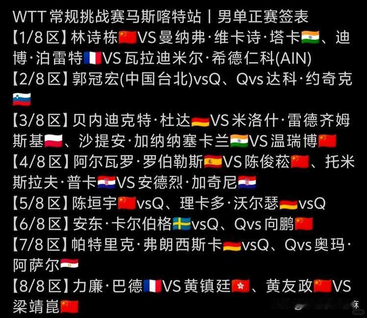 这竞争谁看了不说一声太激烈了吧!400积分的常规挑战赛,叫的上名的,叫不上名的选手都来参赛,甚至有些外协的大主力都参加,比如黄镇廷,达科,杜达,弗朗西斯卡,安东等。 别说外协了,我们国乒也是又一次启动人海战术!光男队就派出了十来名选手(正赛+资格赛) 看这男队这边的签,黄油和大胖又锁S了,黄油大概率打不过大胖。 双打这次换成林诗栋和黄友政搭档,混双也换搭档了,这回搭档石洵瑶了,感觉哪一项都不好打,这是无痛减项的节奏吗?[捂脸] 男单这边,印度选手塔卡看起来挺有实力,之前和莫雷高德那场,塔卡还挺厉害,小莫也是被他打得演了一部默剧一样!周冠达还说莫雷加德终于体会到了别人和他打的感觉,都是挺出其不意的选手,正手也挺强。 上一站周启豪和塔卡打也是打到决胜局,还让二追三险胜。这回第一轮就是林诗栋对塔卡,加油吧!