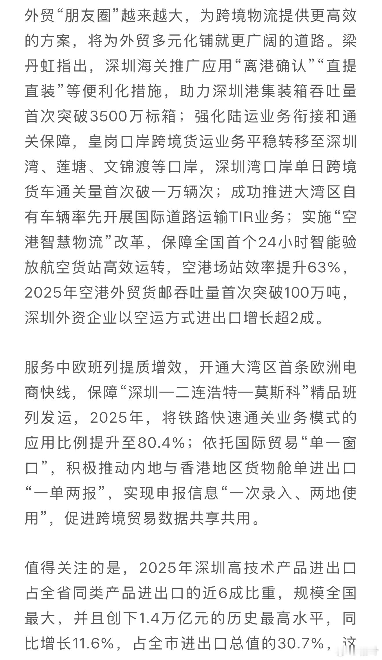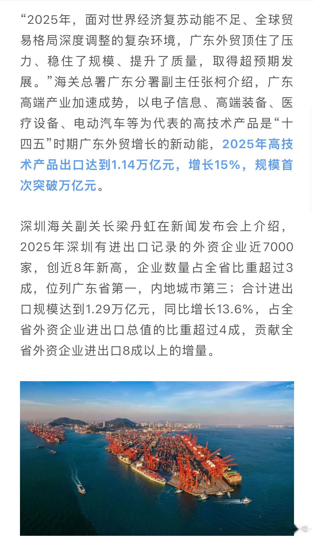 深圳在全球高科技贸易中的地位还是很重要的。这一成绩得益于深圳在集成电路、锂电池、智能设备等领域的持续创新和产业升级,同时依托“新三样”(电动汽车、锂电池、光伏产品)出口的强劲增长,推动外贸结构不断优化