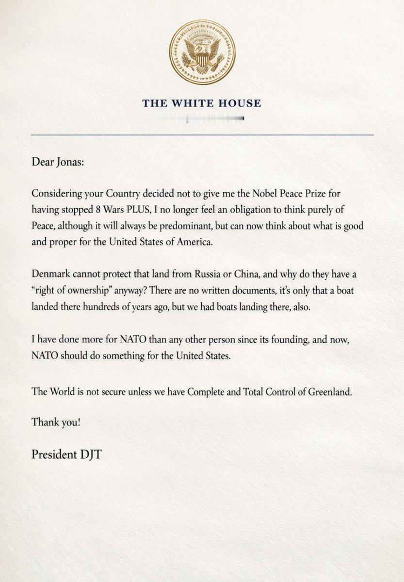 特朗普写给挪威首相的信如下: 亲爱的乔纳斯: 鉴于贵国决定不授予我诺贝尔和平奖,尽管我曾阻止了八场以上的战争,我不再觉得有义务仅仅思考和平,尽管和平永远是我的首要目标,但我现在可以思考什么对美利坚合众国才是有益的。 丹麦无法保护那片土地免受俄罗斯或中国的侵犯,而且他们凭什么拥有「所有权」?没有任何书面文件,只有几百年前有一艘船在那里登陆,但我们也有船在那里登陆。 自从北约成立以来,我为北约所做的贡献比任何人都多,现在,北约也应该为美国做些事情。 除非我们完全控制格陵兰岛,否则世界不会安全。 谢谢! 特朗普总统