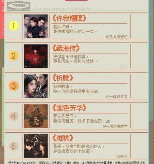 2025年热门剧集白敬亭的现偶还是太权威了 白敬亭的现偶还是太权威了,难哄和桑延拿下2025年热门剧集和年度十大角色,2025年热门剧集有:许我耀眼 、藏海传 、折腰 、国色芳华 、难哄 、白月梵星 、雁回时 、临江仙 、书卷一梦 、生万物 ~