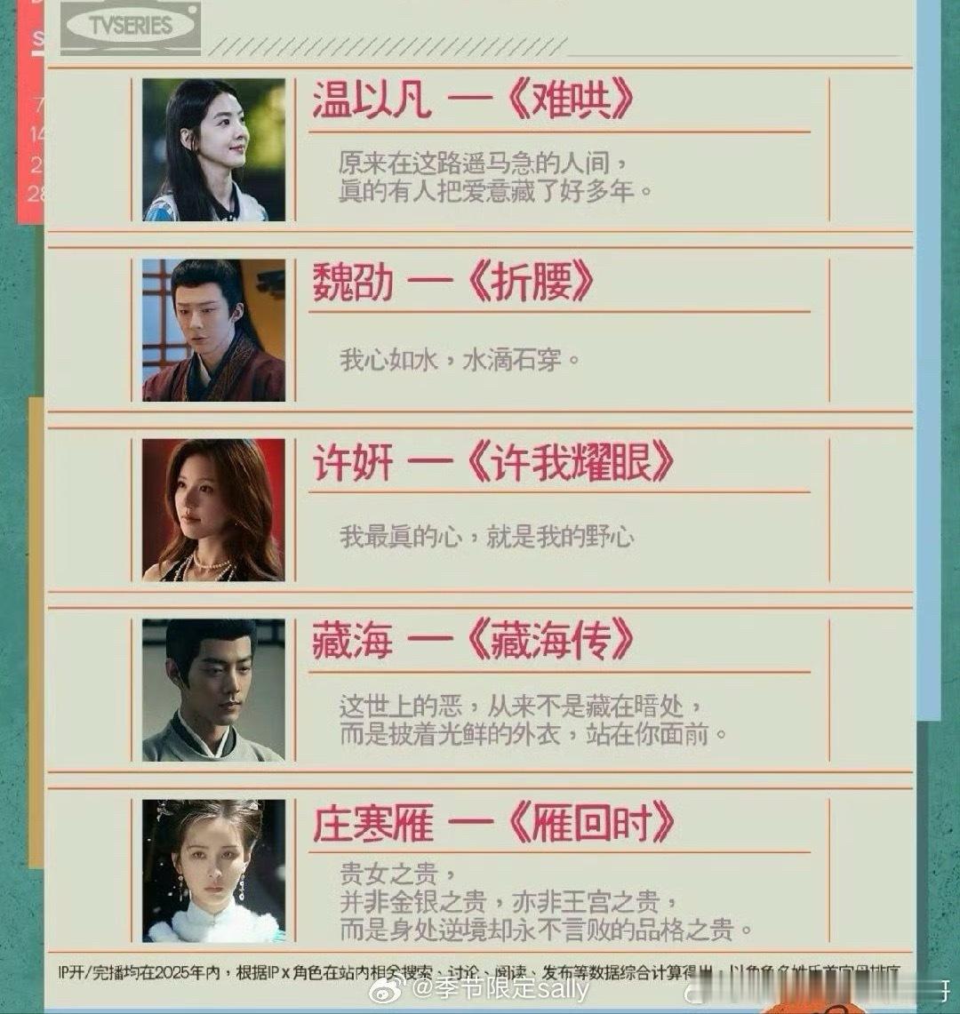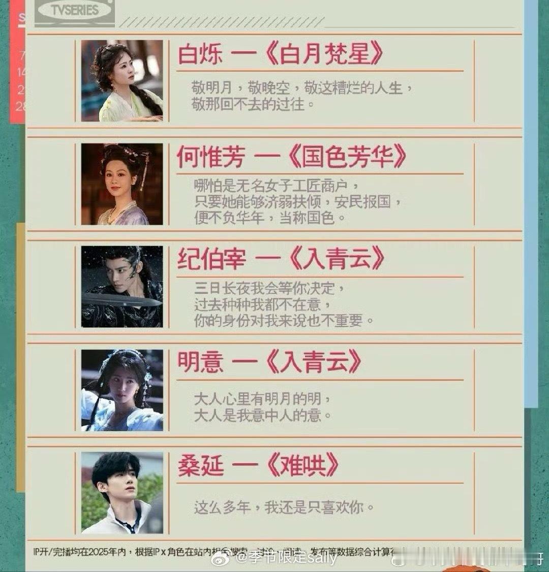 2025十大热门角色 2025十大热门角色:白烁 、何惟芳 、纪伯宰 、明意 、桑延 、温以凡 、魏劭 、 许妍 、藏海 、庄寒雁,来说说你最喜欢哪个角色 2025年度热门剧集
