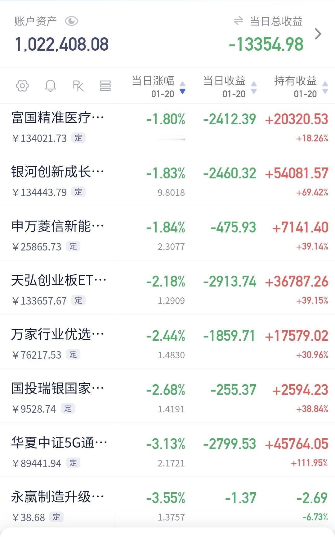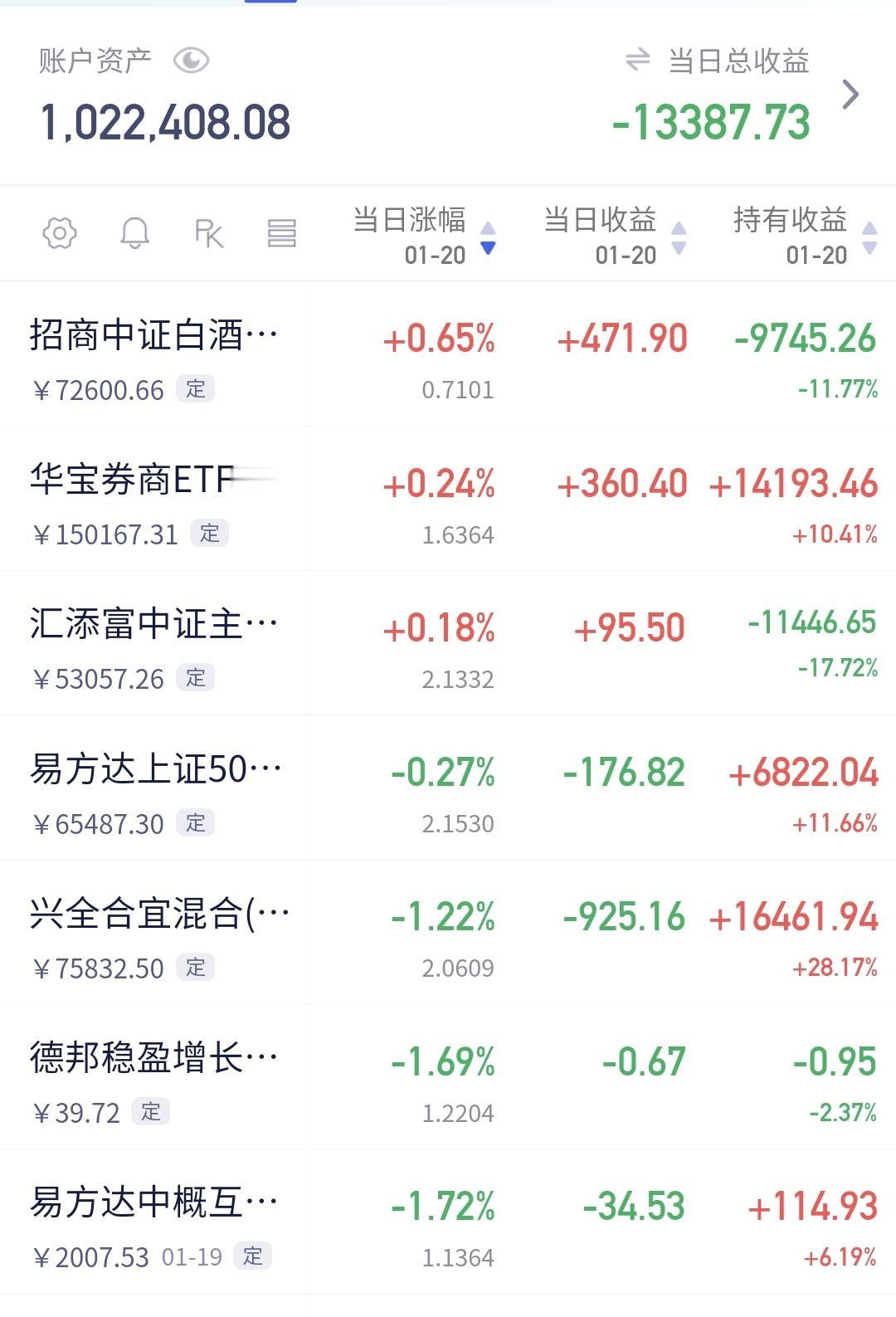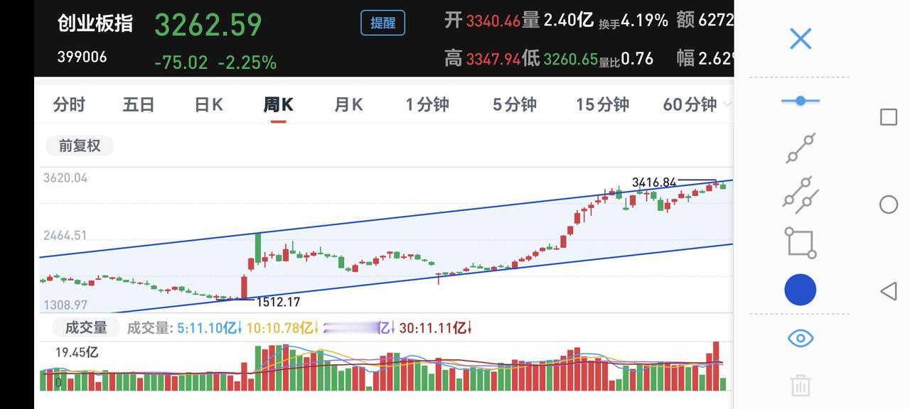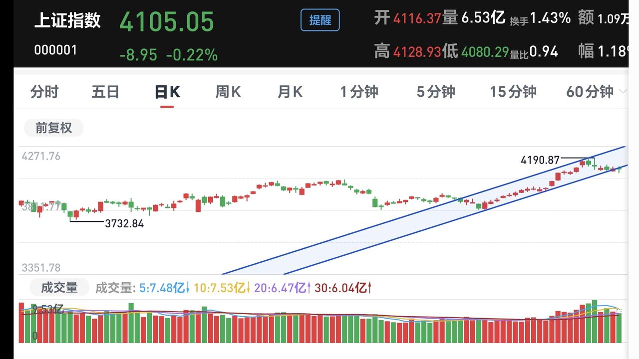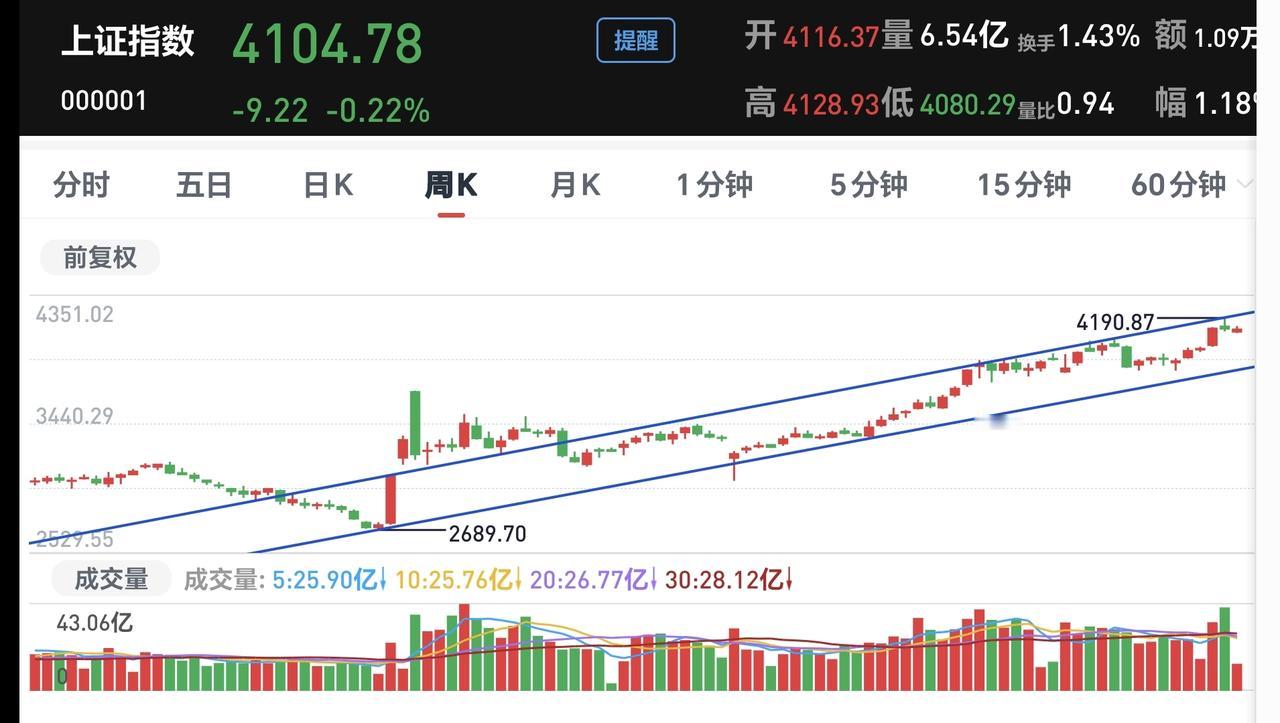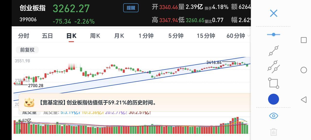 基金:注意,有一个指数已经破位 三大指数现在都是下跌中,创业板指下跌了2.14%,盘中点位3266点,上证指数下跌了0.18%,盘中点位4106点。 我们来看一下下面的截图Z,这是上证指数日K线图,从图中可以看出,我画了两条倾斜向上的斜线,这是上证指数日线级别短期上涨通道,今天已经稍微跌破了这个上涨通道的下轨,如果明天不能上涨,就会跌破这个上涨通道的下轨线。 我们来看一下下面的截图3,这是上证指数周K线图,从图中可以看出,我画了两条倾斜向上的斜线,这是上证指数周线级别上涨通道,上周的最高点就打到了这个上涨通道的上轨线上,然后是回落至今,但现在还是处于上涨趋势中,所以,上证指数大方向向上的走势并没有被改变。 上证指数日线级别短期上涨趋势有可能被破坏,但周线级别的大方向向上,所以,长线持有的人可以继续持有,短线的人需要观察会不会破位短期上涨通道下轨线。 我们来看一下下面的截图4,这是创业板指日K线图,从图中可以看出,我画了两条倾斜向上的斜线,这是创业板指日线级别上涨通道,今天下跌跌破了这个上涨通道的下轨线,也就是说,创业板指日线级别短期上涨趋有可能已经被改变。 我们来看一下下面的截图5,这是创业板指周K线图,从图中可以看出,我画了两条倾斜向上的斜线,这是创业板指周线级别上涨通道,上周曾经突破过这个上涨通道的上轨线,但现在又回落至上涨通道中,也就是说,创业板指周线级别还是处于上涨趋势中。 创业板指日线级别短期上涨趋势有可能已经被改变,周线级别还是处于上涨趋势中,长线持有的人可以继续持有,除非跌破这个上涨通道的下轨,才可以考虑要不要止盈出来观望。 跌破上涨通道的下轨,并不代表100%会下跌,突破下跌通道的上轨,也不是100%会上涨,只是跌破上涨通道的下轨,震荡调整的可能性大一些,突破下跌通道的上轨,震荡上涨的可能性大一些,这就是概率的问题,我们需要按照大概率来办,最后才有可能大概率挣钱。 持有的基金中,估值上涨幅度最大的三个板块是:白酒板块,证券板块,大消费板块,下跌幅度最大的三个板块是:可控核聚变板块,5G板块,军工板块,估值整体亏损了13354元。 我每天都会分享我的观点,我的观点只代表我个人的看法,不能作为你操作的依据,据此操作后果自负。