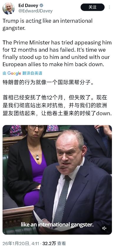 英国反对党自由民主党领袖埃德·戴维今天(北京时间1月20日)写道:“特朗普的行为就像一个国际黑帮分子。首相已经尝试安抚他长达 12 个月,但未见成效。现在是时候我们坚决与他对抗,并与我们的欧洲盟友团结一致,让他做出让步了。” 斯塔默政府过去十二个月里,一直试图以柔性方式维系英美“特殊关系”,甚至不惜在诸多议题上刻意迁就。 特朗普此前二度以总统身份访英时,英方就卯足了劲营造合作氛围,密集放出美方资本的投资承诺,高调签署《科技繁荣协议》,把民用核能、人工智能合作打造成双方关系的亮点,想靠这些看得见的收益稳住特朗普政府。 英方满心指望用1500亿英镑的投资礼包和新增的7600个工作岗位,换得双方在关键议题上的默契,可这份刻意的安抚,终究没能填补彼此的结构性分歧。 特朗普的行事风格本就以自我为中心,从不按常理出牌,对英国的妥协只当是理所当然,反而在核心议题上步步紧逼,丝毫没有让步迹象。 双方在巴以问题上的分歧已然摆上台面,斯塔默政府释放出可能在联合国大会前后承认巴勒斯坦国的信号,特朗普却在联合记者招待会上公开表示反对,两人虽都提及中东和平,立场却泾渭分明。 在对乌政策上,英方始终强调要与盟友一道坚定支持乌克兰,特朗普却执着于以美国为主导推动停火谈判,双方在支持方式与强度上的差异,即便在王室国宴的场合也没能掩盖。 经贸领域的摩擦更是让英方焦头烂额,斯塔默政府曾期待借安抚解决钢铝关税等敏感问题,可双方仅在个别行业做了微调,核心领域的关税清零始终落空。 特朗普偏爱搞“点状交易”,习惯把关税当作谈判筹码攥在手里,这与英国渴望的稳定、可预期的长期经贸安排完全相悖,所谓的全面自贸协定,至今仍停留在口头层面,连可操作的谈判进程都未开启。 更让英方被动的是,即便在达成合作的科技领域,内部质疑声也从未停歇。不少舆论指出,英美签署的《科技繁荣协议》过度偏向美国科技巨头,英国本土创新产业并未获得足够倾斜,反而可能因合作丧失监管主导权,美方承诺的投资能否兑现,更是未知数。 埃德·戴维的发声,实则是戳破了斯塔默政府“以妥协换和平”的幻想,也道出了英国政坛对特朗普政策的普遍焦虑。他很清楚,单独对抗特朗普的难度极大,唯有绑定欧洲盟友,才能形成足够的制衡力量,这也是他为何着重强调要与欧洲盟友团结一致的核心原因。 事实上,自由民主党早已在推动英国与欧洲深化联结,此前就曾建议斯塔默在布鲁塞尔与欧洲领导人会晤时,启动英国加入欧盟关税同盟的进程,认为这能为英国经济注入动力,更能增强对抗特朗普的底气。 欧盟方面也并非毫无回应,新任贸易专员马罗斯·塞夫科维奇就曾表态,愿意接受英国加入泛欧地中海公约,将其作为脱欧后双边关系重启的一部分。这一公约允许欧洲、北非及中东数十个国家的部分商品免关税贸易,对英国而言,无疑是拉近与欧洲关系的重要切口。 只是斯塔默政府仍有顾虑,明确将重新加入欧盟关税同盟和单一市场列为“红线”,仅保留加入泛欧地中海公约的可能性,这种谨慎态度,也让英国与欧洲的联动始终隔着一层。埃德·戴维的呼吁,正是希望政府能打破这种桎梏,放下对美国的幻想,真正与欧洲盟友站在一起。 特朗普政府的行事逻辑,本就只看重美国利益,对盟友的诉求向来置若罔闻。英国长达一年的安抚没能换来对方的妥协,反而在关税、地缘政治等议题上持续被动,这种局面再持续下去,只会让英国的国际话语权不断削弱。 埃德·戴维的表态,既是对斯塔默政府外交策略的质疑,也是对英国未来外交方向的指引。他很清楚,面对特朗普的强硬施压,一味退让只会陷入被动,唯有联合欧洲盟友形成统一阵线,用集体力量与之抗衡,才能迫使对方在关键议题上做出让步,守住英国的核心利益。 当下的英美关系,早已不是昔日牢不可破的“特殊伙伴”,结构性分歧的存在,让双方的合作充满不确定性。斯塔默政府若继续坚持安抚策略,大概率只会徒劳无功,埃德·戴维呼吁的“联欧抗美”,或许会成为英国打破外交僵局的重要路径。 毕竟在特朗普的霸权逻辑里,只有实力与合力才能让其收敛锋芒,英国单独应对终究力薄,唯有与欧洲盟友拧成一股绳,才能在与美国的博弈中占据主动,这也是埃德·戴维表态背后最核心的考量。 官方信源及发布时间:中国日报网《欧洲国家计划派兵格陵兰岛 消解美国“夺岛”借口》,2026年1月12日20时27分。
