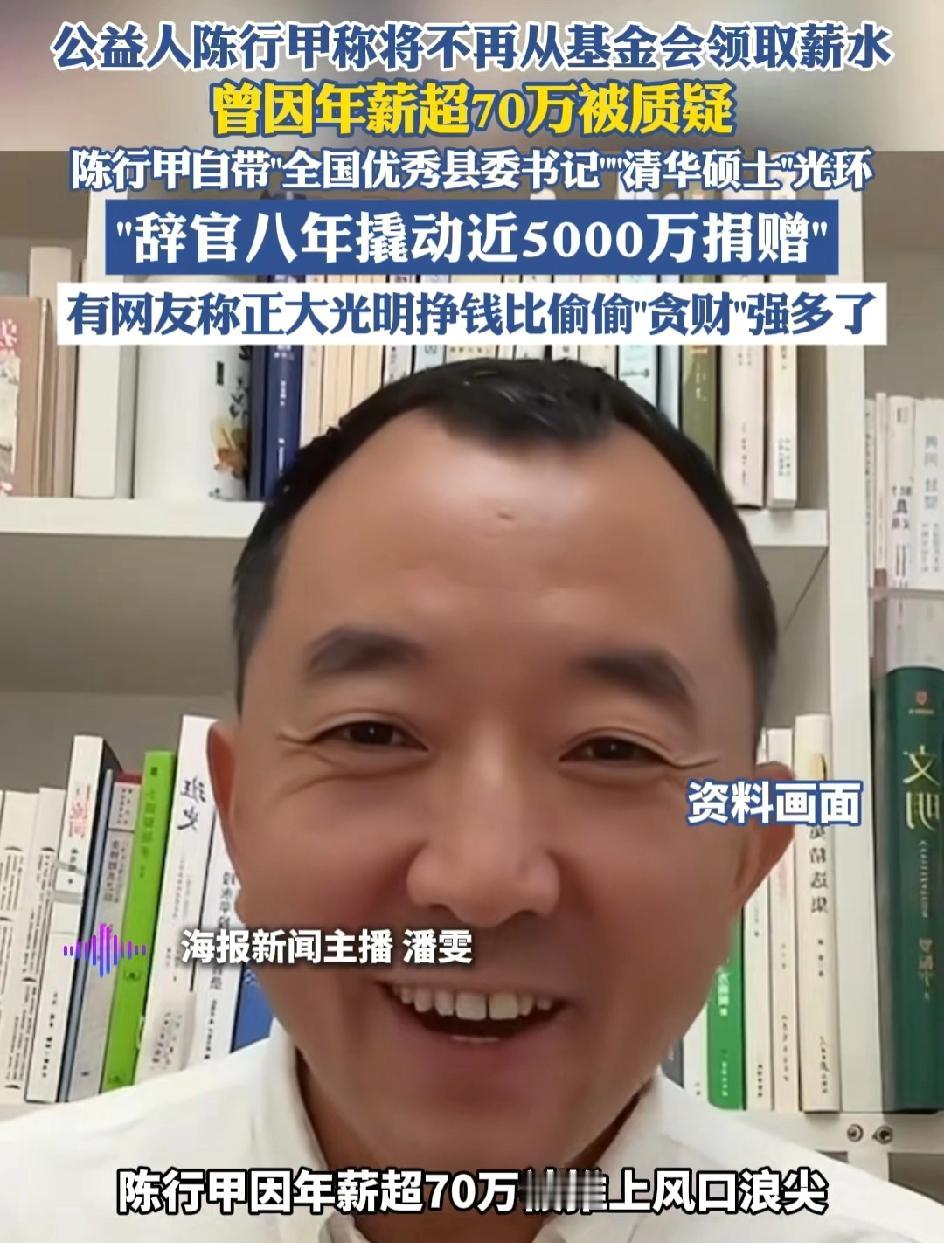感谢网络喷子,你们逼走了陈行甲! 好在俞敏洪用150万年薪捡了个漏,聘任他为新东方的总顾问,基金会70万的年薪,从此他一分都不领取了。当然,基金会的事他也不会再管了,已交给年轻人打理了。 网红公益人陈行甲,从自己创办的恒辉公益基金,去年拿走了73万年薪,前年拿走了90万。 就因为这个事,被网友骂了,说他做公益不该拿高薪。很多人觉得,干公益就得“用爱发电”,领高薪不纯粹。 但像陈行甲这样都人才,领一百万的年薪,他能创造至少一千万的价值,况且熟悉他的人都知道,他是个极有大爱的人,即使领了这么多工资,他也不是用在自己身上的,更多的是用在公益上。 而且,他这工资是经过审计的,是合法合规的,况且公益事业也是一项需要顶尖人才的专业工作,他创造的社会价值,远高于这点工资。 难道有本事的人做公益,就该穷一辈子吗? 幸运的是,陈行甲宣布以后不从基金会领薪了。紧接着,俞敏洪就宣布以150万年薪请他当新东方的总顾问,还承诺每年给他基金会捐至少100万。 给这两位惺惺相惜的大佬点赞!