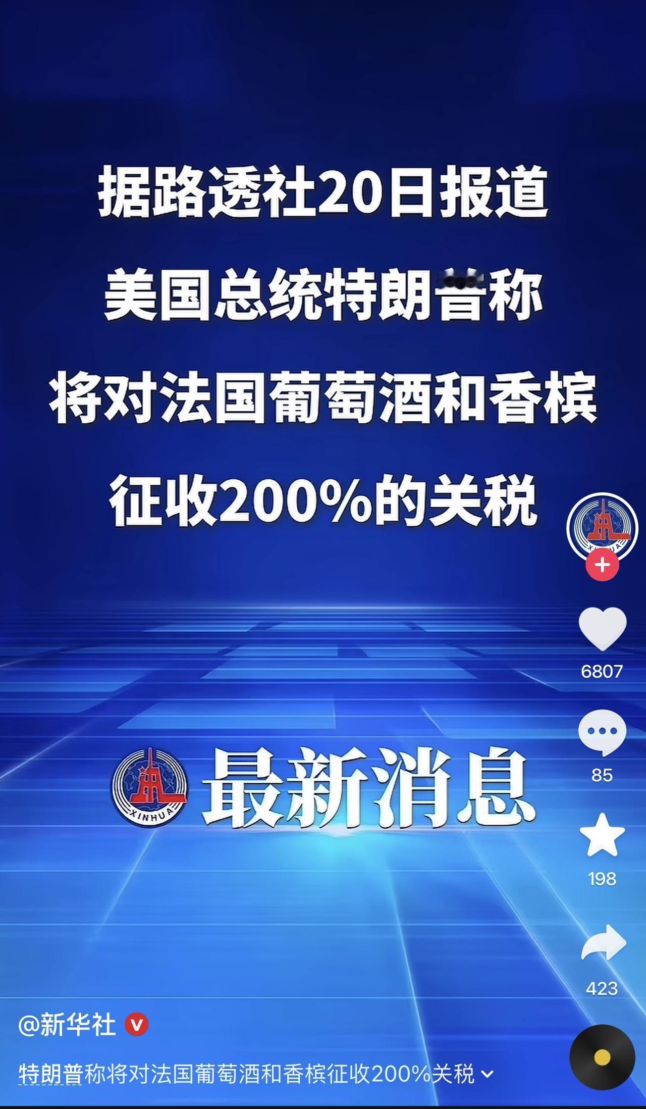 “大师”王冲的预言没实现!公元2026年1月20日,特朗普继续撒欢,对法国葡萄酒加收200%关税!谁让他们派15个人去格陵兰了,人数最多!纷争开始了! 北约彻底内讧了!有好戏看了!法兰西别让我看不起你们嗷!拿出跟我们装x那个架势来!硬刚美国!别怂!不能被他拿捏!怎么着你们历史也爱它们长啊! 马克龙你能不能支棱起来!老被老头老太太欺负呢!在家被老婆打,出门被老太太扔鸡蛋,在美国得给特朗普让路…… 可不是我挑事儿嗷!你差啥啊!美国特朗普关税