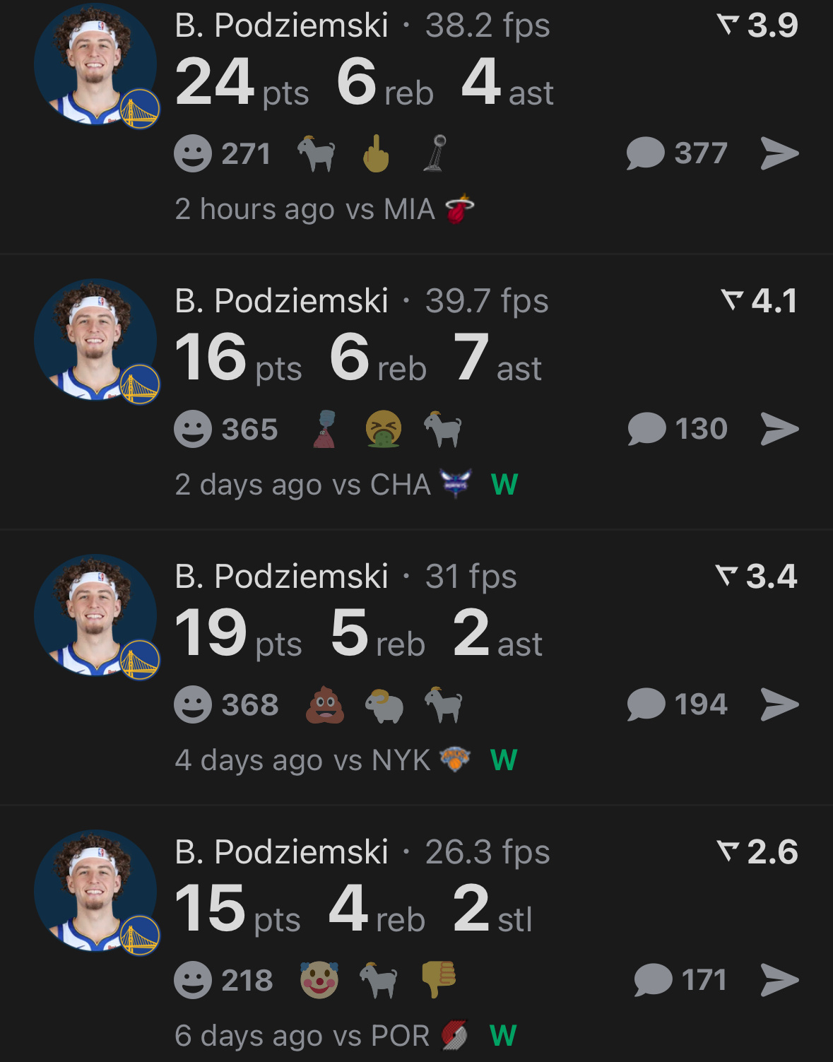 勇士四连胜,连续4场轰进20+三分,热得发紫,连TJD都扔进了生涯第一记三分8连主前7场打完,勇士赢了6场,西部附加赛区的内卷愈演愈烈。但巴特勒的伤退给勇士(以及我的范特西)蒙上了一层阴影...ps对面刚拿周最佳的阿德巴约运动战13中1,生涯最铁一战...热火vs勇士NBA