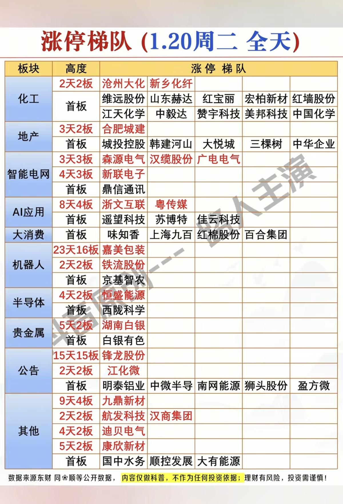 1.20周二 涨停板股票:题材+高度! 1.化工原料 12股涨停 2.地产 6股涨停 3.智能电网 5股涨停 4.人工智能AI应用 5股涨停 5.机器人 3股涨停