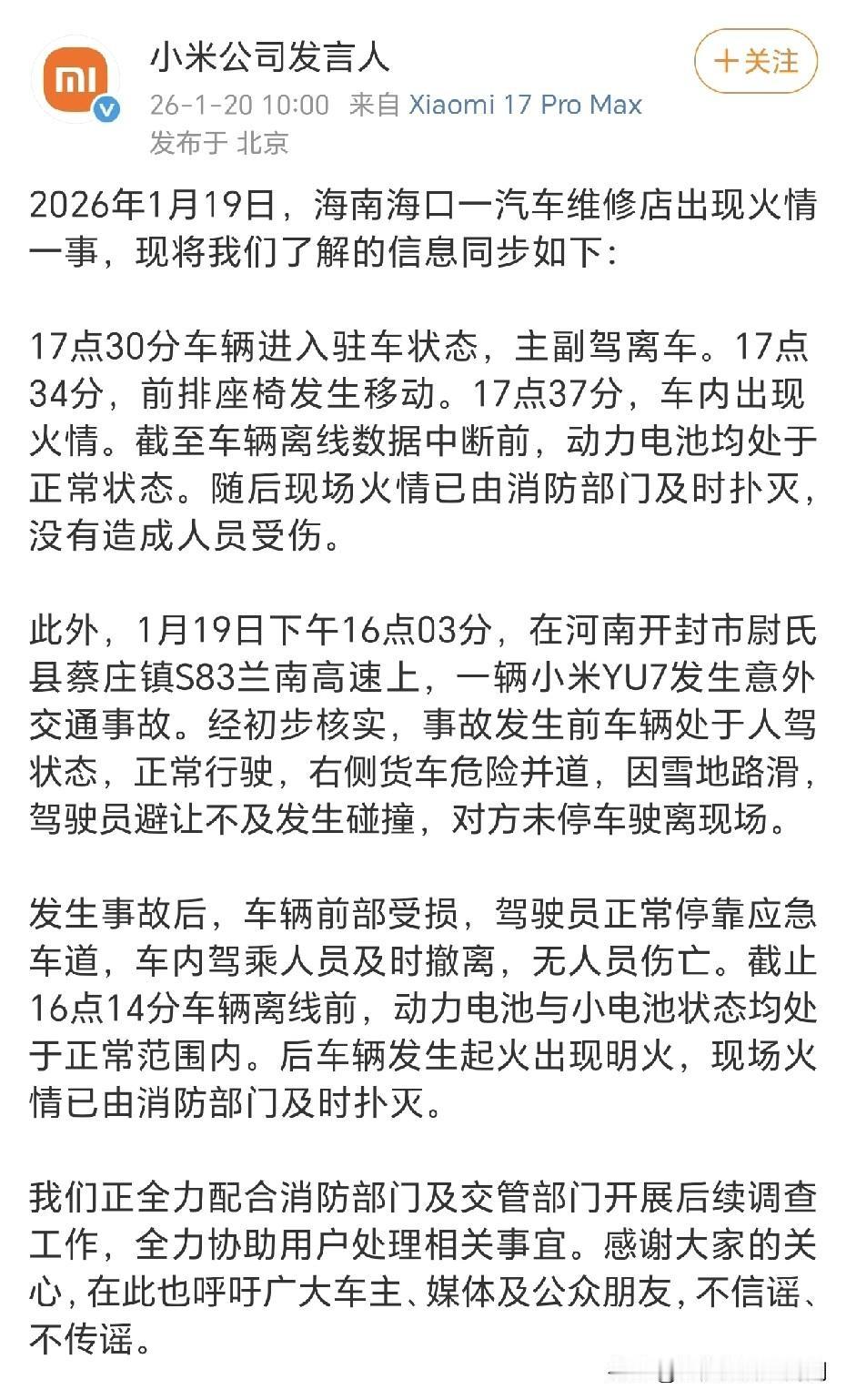 关于昨天海口汽车维修店的一辆S-u7燃烧着火事故,今年官方做了通报,事件过程如下:主副驾离车后,车内出现火情,在车辆离线数据中断前,动力电池均处于正常状态,最后消防部门及时扑灭, 该事故没有造成人员受伤。 从路人拍摄的原视频画面以及被消防扑灭后的现场画面来看,整车前段和上方都被火燃烧了,整个维修店的也是一片狼藉。快过年了,虽然遇到这事肯定心里不舒服,但万幸的是人没事。也希望官方后续能尽快公布起火原因。[祈祷]