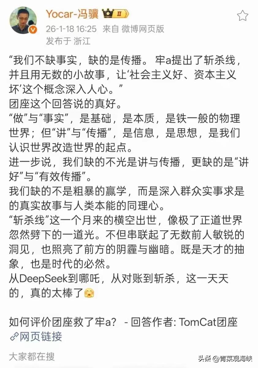 黑神话制作人冯骥谈牢A,说得太好了!他近日直接说:“我们不缺事实,缺的是传播。”他更进一步解释说,“做”与“事实”是基础与本质,铁一般的物理世界,但“讲”与“传播”,更是我们改造世界的起点。而且,还要“讲好”,要“有效传播”。 毫无疑问,牢A完美做到了这一点,他用一个又一个生动的小故事,说清楚了社会主义有多好,资本主义又有多么大的问题。 事实上,不仅是牢A,冯骥制作的《黑神话•悟空》也做到了这一点,这一个游戏承载了我们民族那种逆天改命不屈服不妥协的精神,给整个欧美世界都带去了巨大震撼。从冯骥到哪吒的导演饺子,再到牢A,他们都对我们社会的文化领域做出了巨大的贡献。 这是前所未有的现象。我们这些年在物质上取得了巨大的进步,但是在文化上仍旧有些许不足,但是终于有一个个天才横空出世,他们用他们自己的方式,扩大了我们的文化影响力,让我们知道了自己的强大,让世界也见证了我们的文化,这些年轻人都是好样的! 相信,以后这样的年轻人还会越来越多。这是必然的!