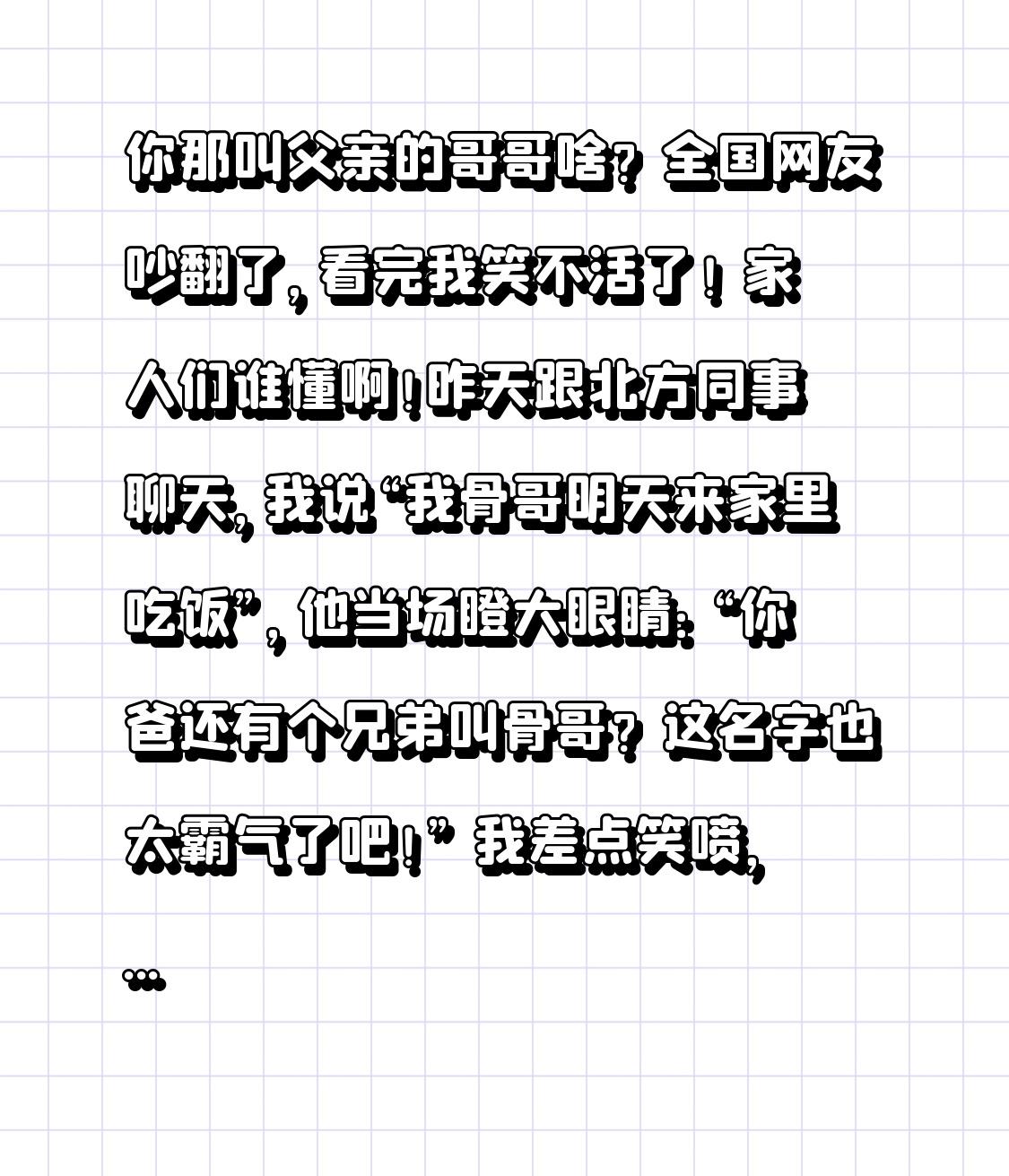 你那叫父亲的哥哥啥?全国网友吵翻了,看完我笑不活了! 家人们谁懂啊!昨天跟北方同事聊天,我说“我骨哥明天来家里吃饭”,他当场瞪大眼睛:“你爸还有个兄弟叫骨哥?这名字也太霸气了吧!” 我差点笑喷,原来不是所有人都知道,在我们老家,父亲的哥哥就叫“骨哥”啊! 其实一开始我也觉得这称呼奇怪,小时候问过我妈,为啥不叫大伯二伯,偏要叫“骨哥”?妈说这是老祖宗传下来的,“骨”代表骨肉至亲,比“伯”更显亲近。直到上周刷到一个话题,全国对父亲哥哥的称呼有多野,我才发现原来各地的叫法能差出一个银河系! 山东网友说他们叫“大爷”,而且得读四声,喊的时候自带威严,小时候调皮,一听见“大爷来了”,立马收敛起浑身的反骨;河南网友笑称叫“伯”,发音短促有力,听着就亲切,逢年过节走亲戚,“伯,吃块糖”是标配;广东朋友的“阿伯”带着软糯的腔调,配上粤语发音,莫名有种港片里的温情感;最让我意外的是福建网友,居然叫“大爸”,刚开始以为是口误,直到看到几十条评论都这么说,才知道是当地的传统。 本来以为只是单纯的称呼差异,直到有个网友的评论看哭了很多人:“我们老家叫‘伯爷’,小时候总嫌这称呼老土,跟同学炫耀我有个‘伯爷’,他们都笑我跟不上时代。直到伯爷走了,再也没人喊我‘囡囡’,再也没人在我放学时守在村口,手里攥着刚买的烤红薯。现在每次听到别人喊‘伯爷’,我都忍不住回头,总觉得还能看到那个熟悉的身影。” 其实不管是“骨哥”“大爷”“伯”还是“大爸”,称呼虽异,藏在背后的都是一样的温情。他可能会在你犯错时替你求情,会在你缺钱时默默塞钱,会在你远走他乡时反复叮嘱“照顾好自己”。这些带着地域特色的称呼,不只是一个代号,更是刻在我们骨子里的乡愁,是连接亲情的纽带。 你们那里把父亲的哥哥叫啥?是和我一样的“骨哥”,还是有更特别的称呼?评论区分享出来,看看有没有老乡!也别忘了给这份藏在称呼里的亲情点个赞,让更多人想起那个默默疼我们的“他”~
