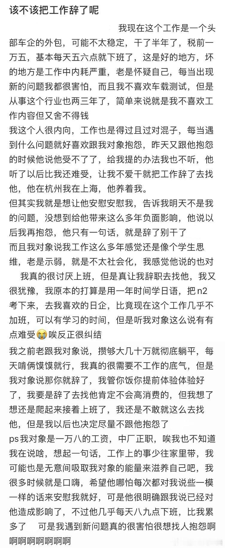 不建议辞职,女生抱怨这是很正常的事情,男生工作也会抱怨,只是抱怨的方式不一样而已。 但是女生抱怨多了男生确实会烦,这是很正常的,得过且过吧。