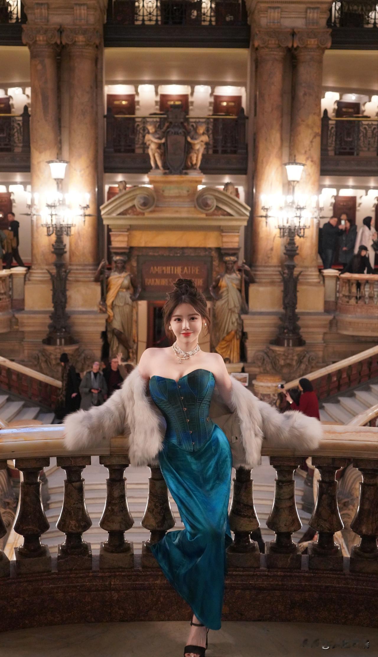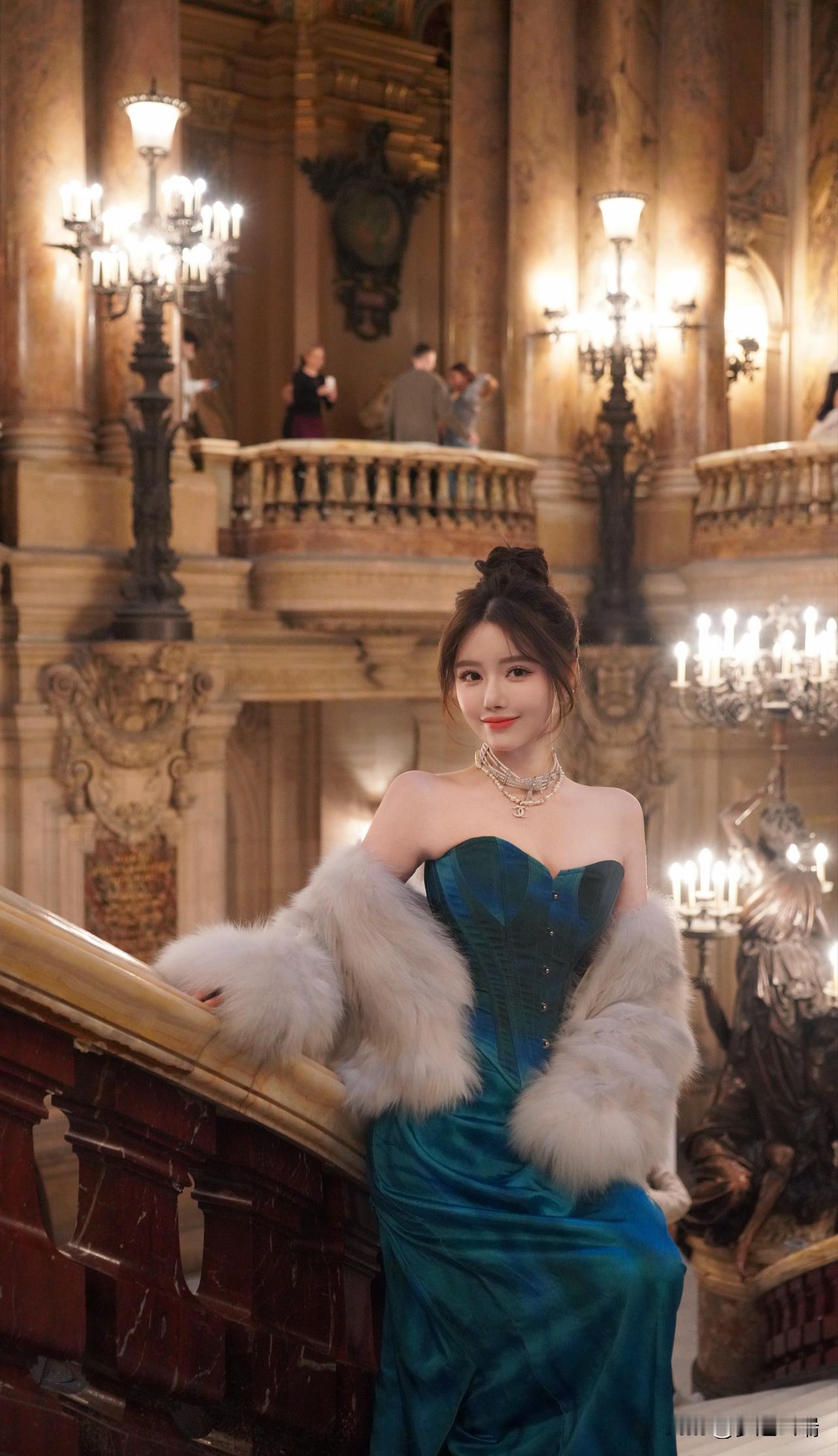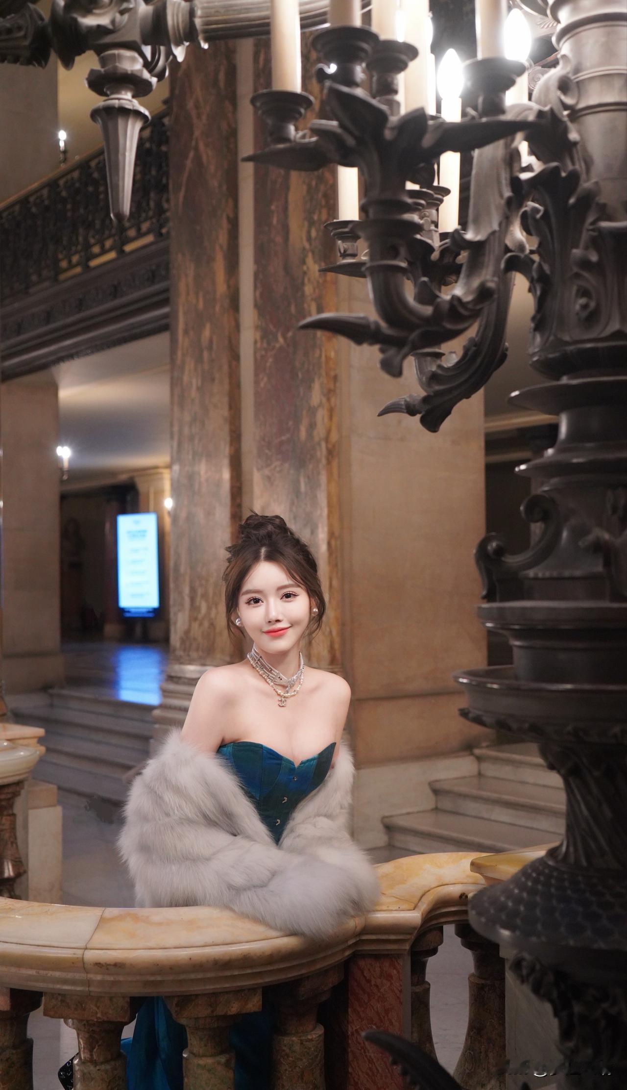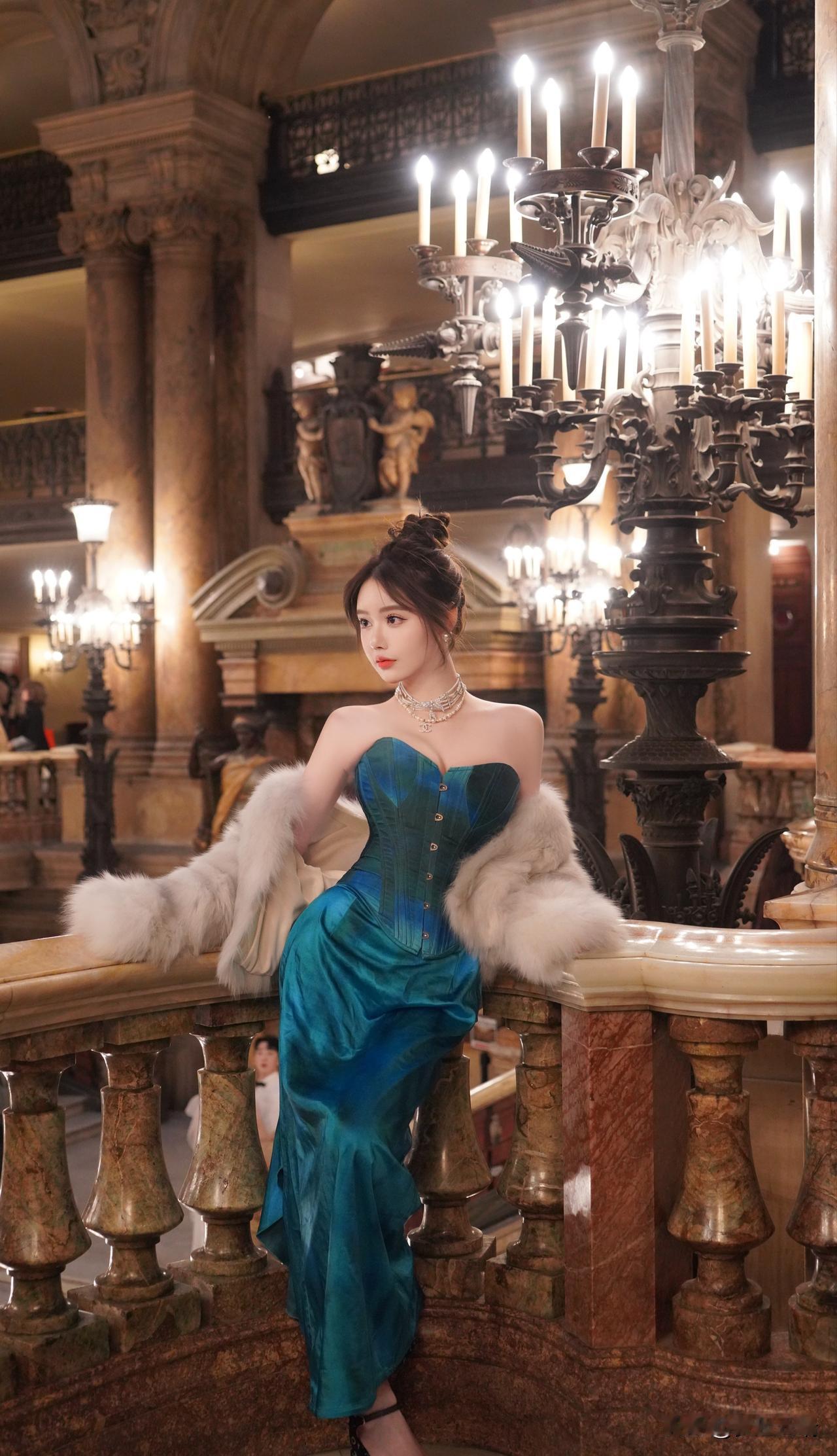 优雅复古风,蓝宝石礼服与奢华环境的完美搭配,尽显高贵气质。