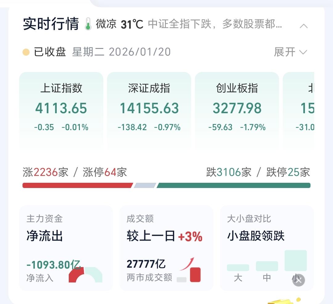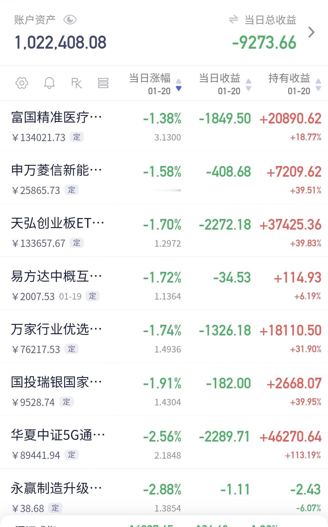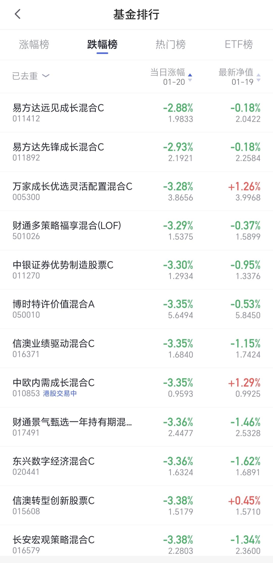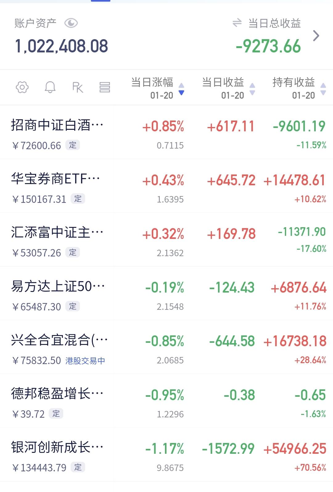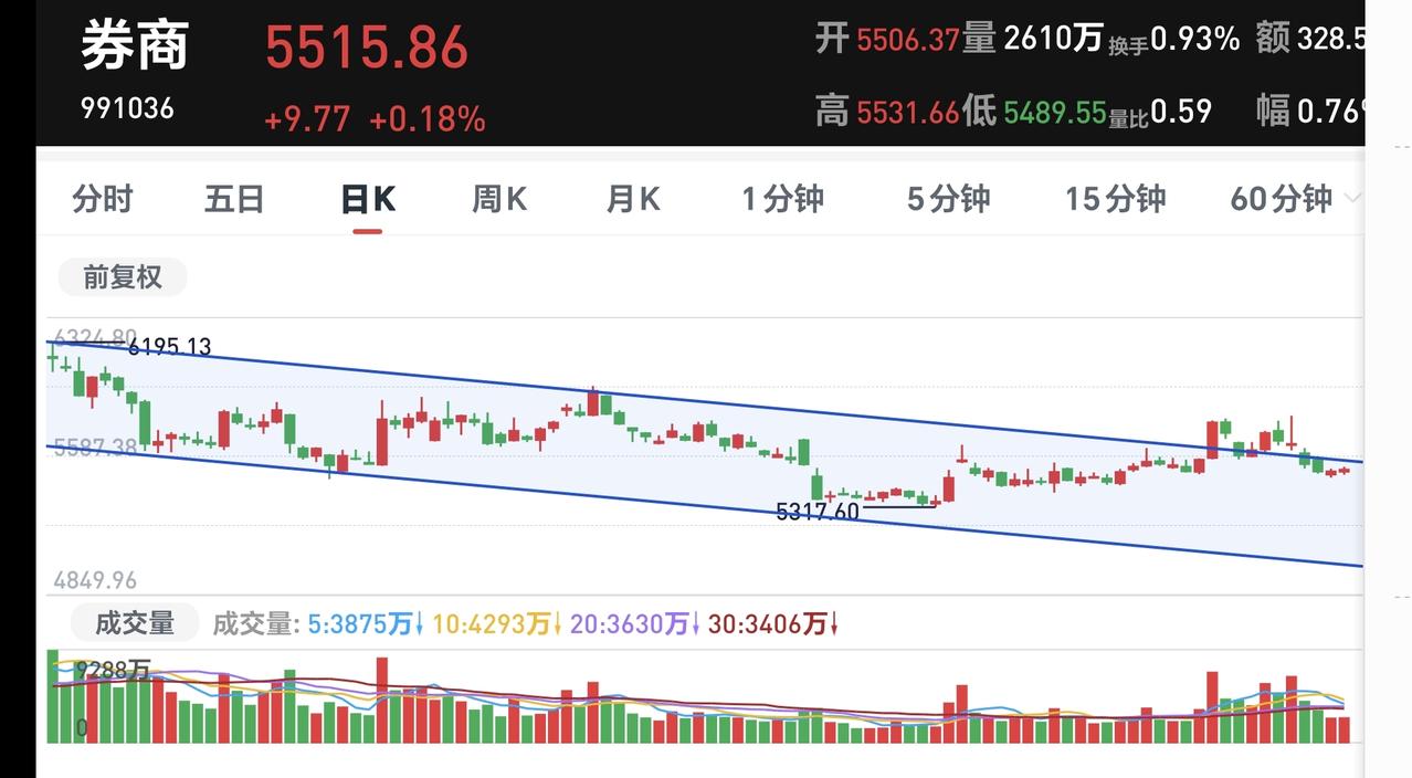 基金:震荡下跌调整有没有结束 今天市场高开以后震荡向下,三大指数都是下跌,创业板指下跌了1.79%,收于3277点,上证指数下跌了0.01%,收于4113点。 整个股票市场,上涨2236家,下跌3106家,涨停64家,跌停25家,上涨家数少于下跌家数。 今天两市累计成交27777亿,相比于昨天放量了3%,内资净流出1264亿。 持有的基金中,下午收盘的时候,估值上涨幅度最大的三个板块是:白酒板块,证券板块,大消费板块,估值下跌幅度最大的三个板块是:可控核聚变板块,5G板块,军工板块,估值整体亏损了9273元。 整个基金市场,上涨8220家,下跌10026家,没有上涨幅度超过5%的基金,下跌幅度超过5%的22家。 图9是今天基金的上涨排行榜,图10是今天基金的下跌排行榜,图11是ETF上涨幅度排行榜,图12是今天基金的加仓榜,图13是今天基金的减仓榜。 1:今天收盘的时候,5天线位置是4113.65点,收盘点位也是4113.65点,你说这个点位巧不巧。 2:今天主力资金净流出超过了1000亿,这是资金在大幅度的逃跑,从资金的角度来看,后市的走势还需要谨慎。 3:今天上证指数收在5天线上,创业板指跌破了5天线,并且跌破了上涨通道的下轨,从指数的角度看,后市的走势还需要谨慎。 4:我们来看一下下面的截图14,这是科创50板块周K线图,从图中可以看出,我画了两条倾斜向上的斜线,这是科创50板块周线级别上涨通道,现在的位置处于这个上涨通道中,也就是说,科创50板块周线级别处于上涨趋势中,科创50板块大方向向上,持有的人可以继续持有,除非跌破这个上涨通道的下轨,才可以考虑要不要止盈出来观望。 我们来看一下下面的截图15,这是券商板块日K线图,从图中可以看出,我画了两条倾斜向下的斜线,这是券商板块日线级别下跌通道,前段时间上涨突破了这个下跌通道的上轨,但后来又跌回到了下跌通道内,今天的上涨并没有改变券商板块日线级别的下跌趋势。 我们来看一下下面的截图16,这是券商板块周K线图,从图中可以看出,我画了两条倾斜向上的斜线,这是券商板块周线级别上涨通道,现在的位置处于这个上涨通道内,距离上涨通道的下轨比较近,如果在这里能够止跌反弹,这里就是券商板块的进场点,如果跌破了这个上涨通道的下轨,持有的人可以考虑要不要止盈出来观望。 我花30分钟把文章写出来,你花1秒钟点一个赞,花30秒钟写一个评论,评论和点赞是你的美德,谢谢大家的评论,点赞,转发和分享。 我每天都会分享我的观点,我的观点只代表我个人的看法,不能作为你操作的依据,据此操作后果自负。