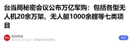 赖清德又在疯狂玩火,挑战大陆的忍耐底线了!1月19日,台防务部门在台“立法院”秘密举行会议后,公布最新一批军购清单部分内容,其中包括采购20万余架无人机和1000余艘无人艇,价值1.25万亿新台币。 这笔1.25万亿新台币的军购款,可不是个小数目。换算成人民币大概是2755亿,相当于台湾两年的教育预算总和,足够建50所大型医院,能填补全台十年的养老缺口。 可赖清德偏要把这笔本该用在民生上的钱,大把扔进军火黑洞。现在台湾岛内税收已经短征300到500亿新台币,医疗、养老这些民生支出一直在被挤压,家家户户还要因为这笔军购额外承担近10万新台币的负担,相当于2.2万元人民币,老百姓早就怨声载道了。 更让人不齿的是,这笔军购背后全是猫腻。台湾民众党主席黄国昌爆料,美国国务院2025年12月公布的对台军购项目合计才3000亿新台币,可民进党当局编列的特别军购预算却高达1.25万亿元,近9500亿元的差额去向成谜。 民进党当局对此只敢模糊回应,根本不敢公开预算具体构成。大家都心里清楚,这些多出来的钱,不少都成了赖清德嫡系通过指定供应商、量身定制技术参数等手段,进行利益输送的“肥肉”,军购订单早就变成了他们中饱私囊的分赃工具。 而且台当局买的这些武器,根本就是中看不中用的“破铜烂铁”。台军采购的部分无人机用的是民用零部件,成本低廉却卖得死贵,妥妥的花冤枉钱当冤大头。 他们自己造的无人艇更离谱,原型艇测试的时候直接就失踪了,这么不靠谱的装备,现在还要强行扩产,到底是想搞防务还是想捞钱,明眼人一看就懂。 之前台审计部门就曝光过,美军售存在价格虚高、重复收费的问题,雷神公司曾多收台方约54亿元,而美方累计没交付的军售总额已经达到6751亿元,相当于2026年台湾防务预算的七成,所谓的“防务升级”不过是自欺欺人的骗局。 赖清德之所以这么上赶着给美国送钱买武器,说白了就是想“倚美谋独”。他心里清楚,单凭台湾的实力根本对抗不了大陆,就想抱着美国的大腿,通过不断军购向美国纳贡表忠,换取美国对“台独”的支持。 可美国哪里是真心帮台湾,不过是想把台湾打造成“刺猬岛”,复制代理人战争模式,让台湾替美国遏制大陆,最终牺牲的还是台湾民众的安危。 之前就有路透社爆料,民进党当局一直和美国谈判,想通过高额军购寻求支持,而美方还狮子大开口,要求台湾拿出GDP的5%到10%来军购,这根本就是把台湾往死里榨。 更危险的是,这次军购清单里的装备,彻底撕下了台当局“防御性国防”的伪装。 清单里既有滨海监侦、攻击、自杀式等多种无人机,还有航速35节以上的蜂群作战无人艇,再加上“海马斯”火箭炮、战术导弹等进攻性装备,预算里还包含战术网络与情资分享系统,说白了就是让台军全面融入美军作战体系,这无疑是在加剧台海紧张局势。 赖清德这么做,就是想配合美国极端反华派的“台海布战”图谋,主动效仿乌克兰、以色列,大搞“全民皆兵”,把台湾推向兵凶战危的险境。 可赖清德打错了算盘,他以为买几架无人机、几艘无人艇就能“以武拒统”,简直是痴人说梦。两岸实力差距早就形成了不可逆的态势,解放军早就建成了完善的反无人机、反舰防御体系,台当局买的这些所谓“新利器”,在解放军的现代国防体系面前,根本不堪一击。 国台办发言人朱凤莲早就明确说过,“台独”分子分裂国家、破坏两岸关系,我们将采取一切必要的惩治措施,依法终身追责。“台独”分子在“台独”绝路上越疯狂,反“独”的绳索就勒得越紧,等待他们的将是正义的审判和身败名裂的下场。 台湾民众心里都清楚,要和平、要发展、要交流、要合作才是主流民意。赖清德当局顽固坚持“台独”分裂立场,不断勾连外部势力,“以武谋独”,根本不顾台湾民众的死活。 他们这么搞下去,只会让台湾的财政越来越空虚,民生越来越艰难,台海局势越来越紧张。美国不管向台湾卖多少先进武器,都阻挡不了中国终将统一也必将统一的历史大势。 赖清德该醒醒了,大陆的忍耐是有底线的,“台独”是绝路,“以武谋独”更是死路。再这么疯狂玩火,只会把台湾推向万劫不复的深渊,而那些押上全岛民众福祉的“台独”分子,必将被永远钉在历史的耻辱柱上,遭到全体中华儿女的唾弃和谴责。