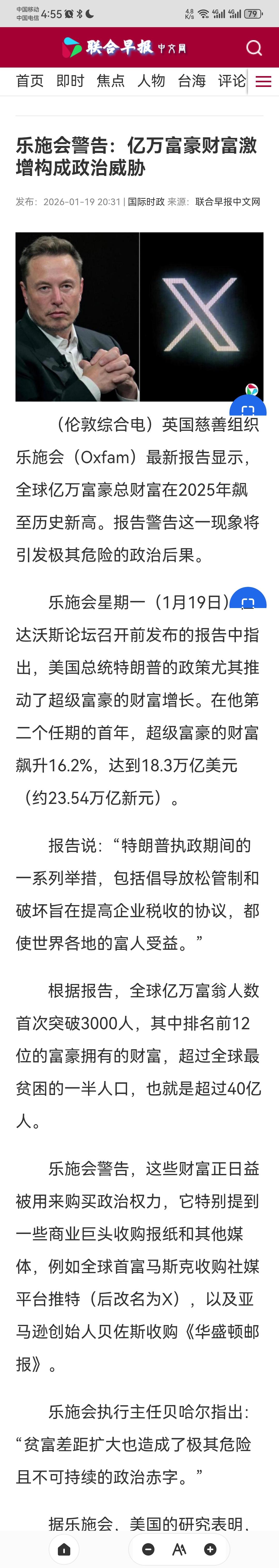 《联合早报》恐怕也没有想到,它的这篇报道从数据上直接论证了美国“斩杀线”的存在。 1月19日,《联合早报》报道说,最近英国一个慈善组织“乐施会”出台了一份报告,指出了一个令人触目惊心的现象,那就是现在全球富豪财富都在激增,尤其是美国的富豪。根据“乐施会”统计,特朗普第二次上台后,美国超级富豪的财富陡然增加了16.2%,总体达到了18.3万亿美元这个令人头皮发麻的数字,之所以如此,是因为特朗普推行的减税等措施给了美国超级富豪一个巨大的便利,让他们更容易攫取财富。 而这还不是最可怕的,最可怕的一点在于这些富豪有钱了之后,就开始利用自己的金钱增加政治上的影响。美国一项报告指出,当美国推行某一个政策的时候,如果如果富人支持,那么这项政策得到采纳的概率为45%,但如果富豪反对,那么其被采纳的概率就会骤然降低到18%。这也导致现在整个美国社会都越来越偏向于富人,对中层、底层都更加苛待。 这个令人触目惊心的数据,与最近“斩杀线”概念的流行,完美契合了起来。美国贫富差距巨大,而且变得越来越严重,有越来越多的人跌落到斩杀线之下,这个是跟美国现在的现状分不开的。《联合早报》恐怕也没有想到,它的一篇普通报道,反而是从数据的角度严格佐证了“斩杀线”这个概念的真实性。毕竟,那么多钱都集中到了富豪身上,社会整体财富又没有什么增长,美国的底层、中层民众,又怎么可能不被“斩杀”呢? 只能说牢A是真的厉害!他提出的“斩杀线”这个概念太精准了!无数公知、高华,想要反驳这个说法,但是现实中却是有越来越多的案例,越来越多的案例,雄辩地证明了这个概念的真实性。