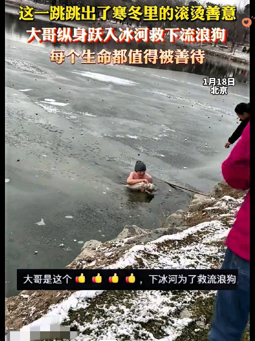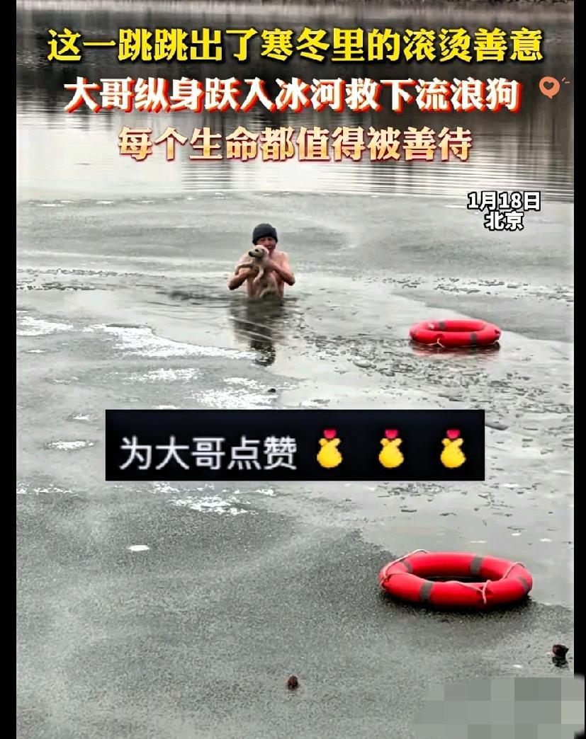 这则暖心新闻最打动人的,从来不是“救狗”这件事本身,而是藏在行动里的“无差别善意”——对生命的尊重从不分物种。 北京寒冬里,小狗踩碎冰面落水,眼看就要被冻僵,大哥二话不说脱衣跳湖,用胳膊破冰救人,连帽子都没顾上摘。 要知道低温湖水有多危险,冷休克几分钟就能让人失去行动力,可他眼里只有那条快没力气扑腾的小生命。 更难得的是岸上的群众,没当旁观者,而是主动递衣服、擦水,帮小狗回暖,这份默契的善良才最让人动容。 善良从不是非要做惊天动地的大事,而是见弱小不旁观、遇危难敢伸手。 这种不分轻重、不论物种的善意,才是让社会变温暖的底气,你被这份双向的善良打动了吗?