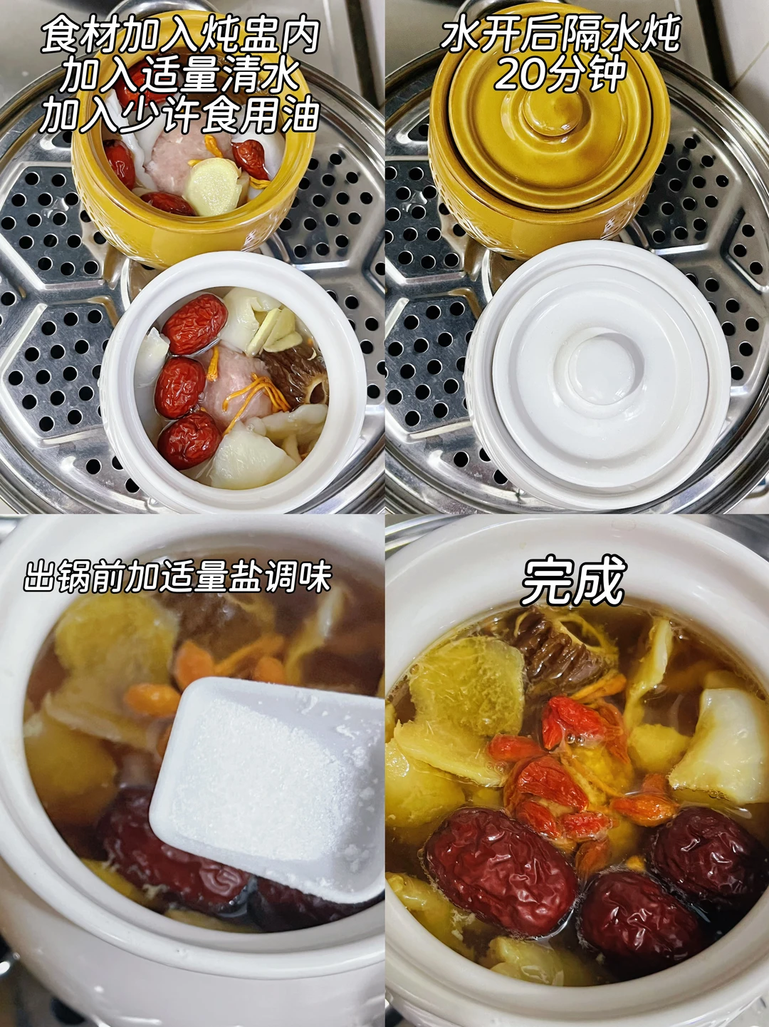 2️⃣食材倒入炖盅内,加入清水,食用油,水开炖20分钟。