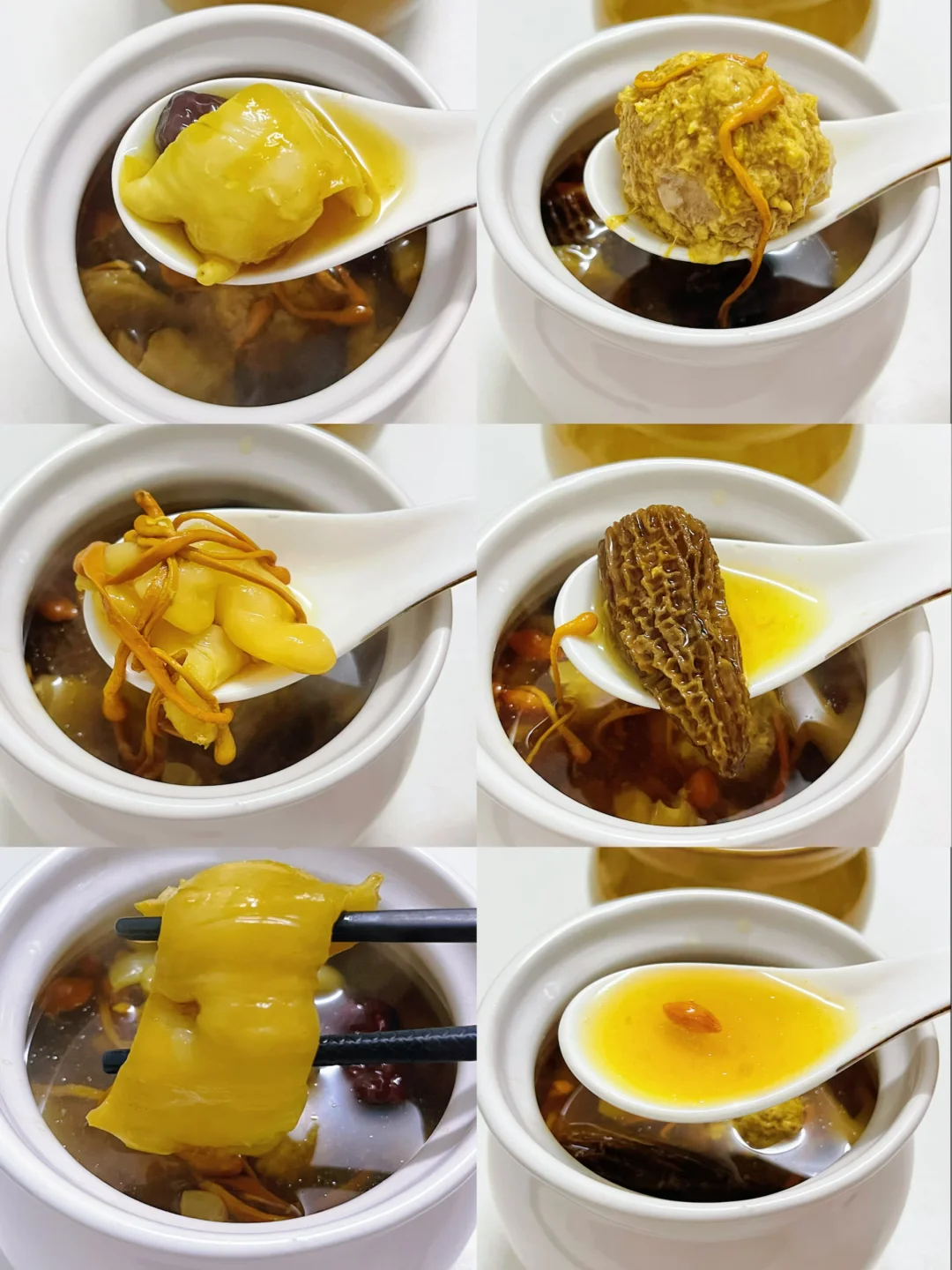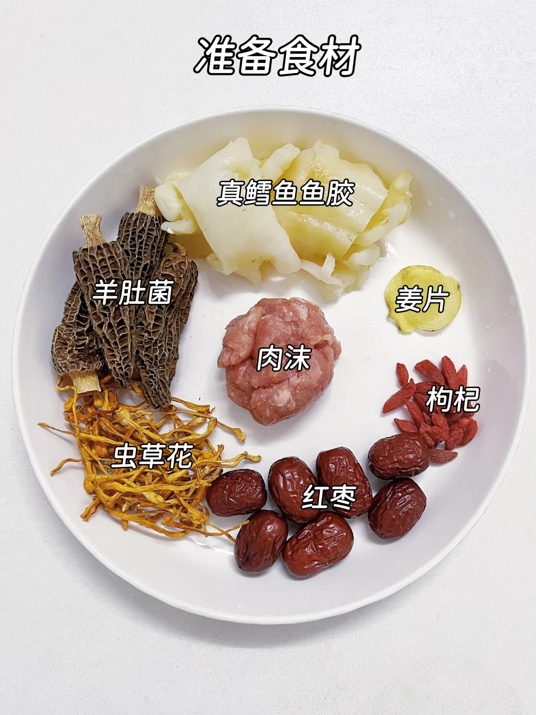 真鳕鱼鱼胶、羊肚菌、虫草花、肉沫、姜片