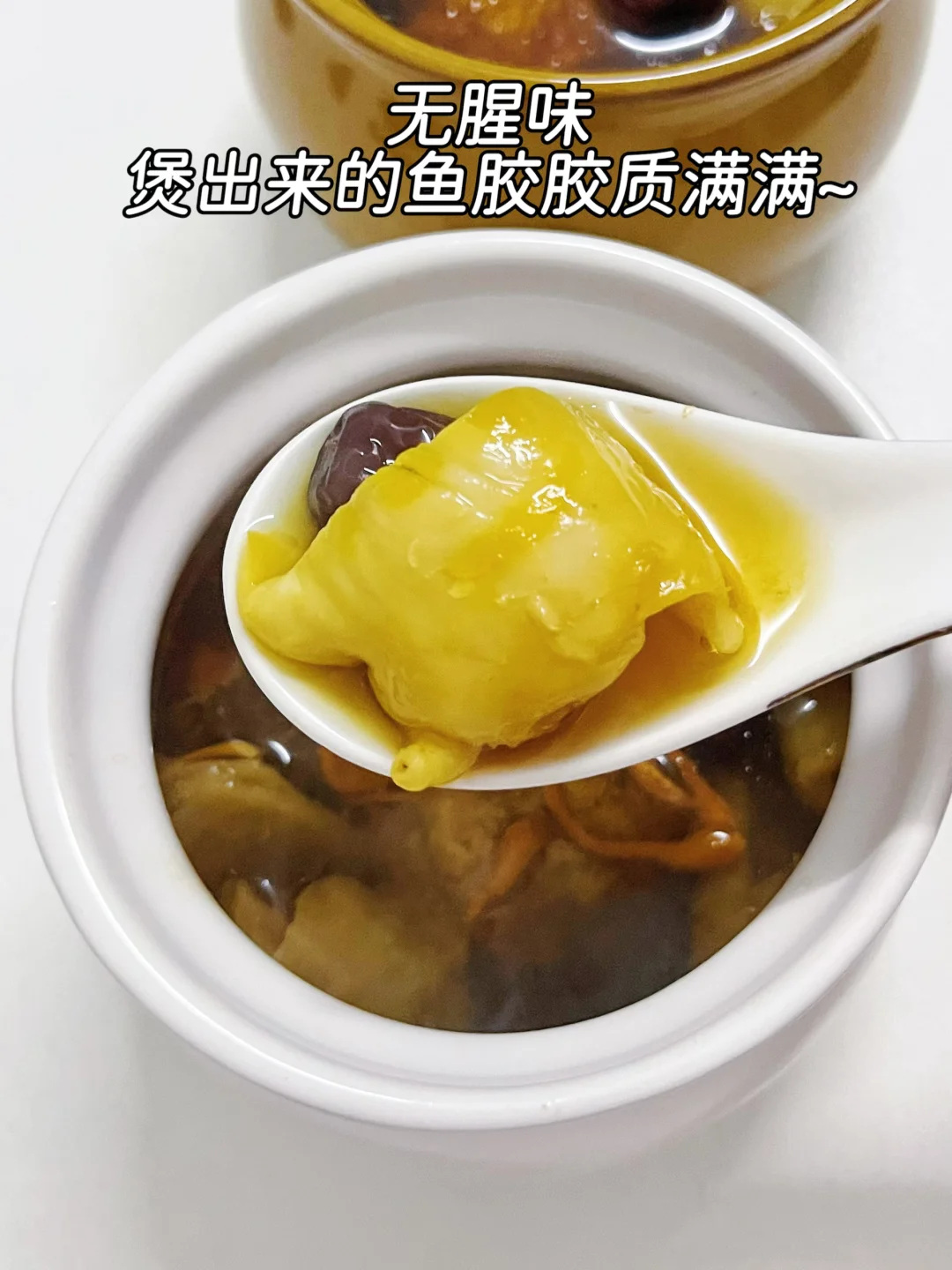 这个菌菇鱼胶汤就做好了,炖出来一点腥味也没有,鱼胶胶质满满,肉质也厚实,喝一碗滋润养颜,全家都可以喝~