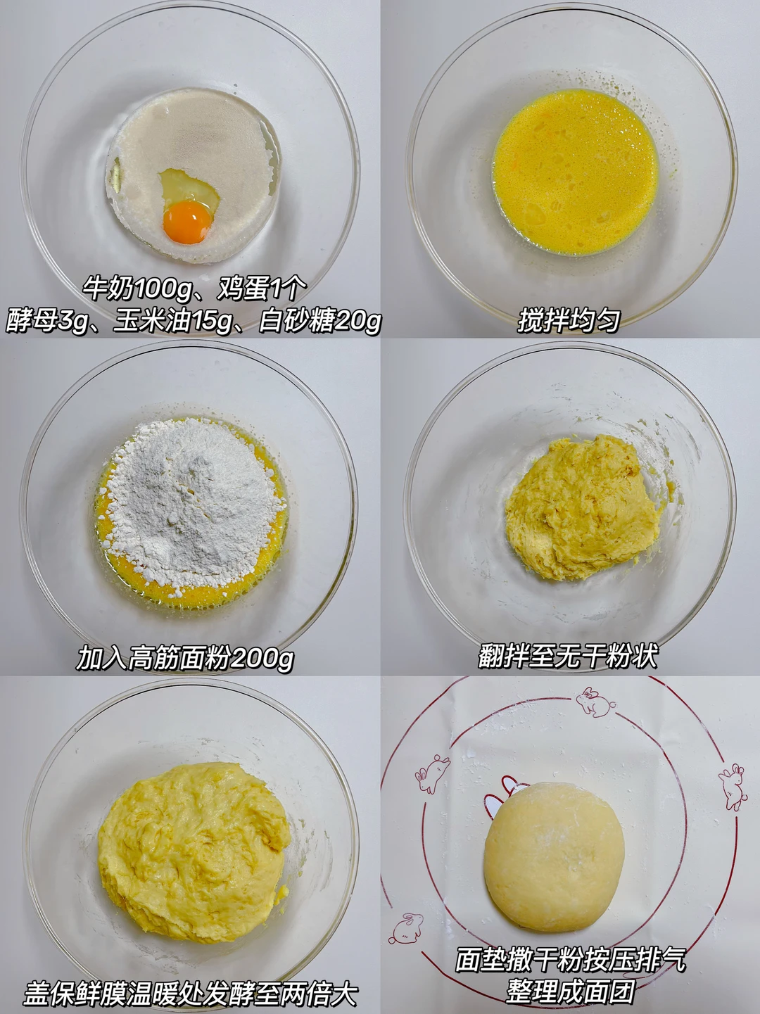 免揉面!免手套膜! 搅一搅就能成的奶香小面包, 软fufu还能拉丝,小朋友一口一个停不下来~ 👩🏻🍳 高筋面粉200g 牛奶100g 耐高糖酵母3g 白砂糖20g(宝宝吃可省略) 玉米油15g 鸡蛋1个 🔎具体做法见图