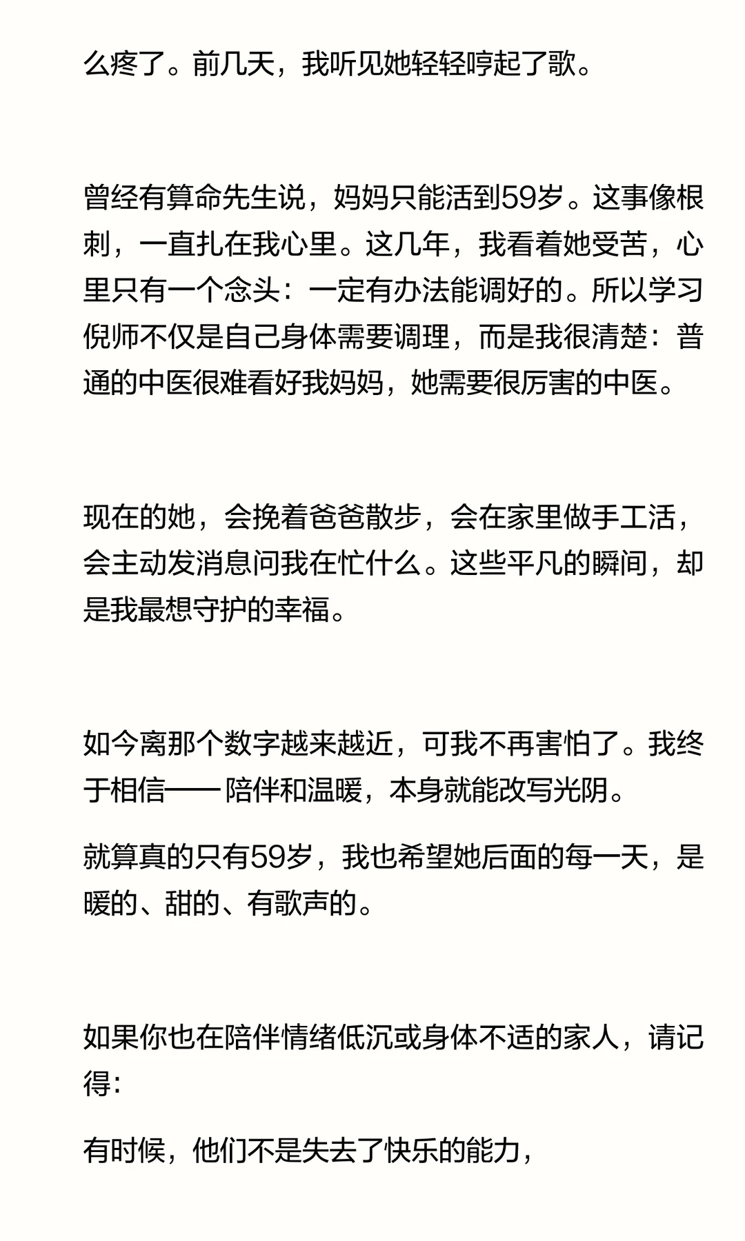 妈妈因抑郁症陷入低谷,通过中医调理,帮助她恢复健康。从情绪低落到重新散步、做手工,她的生活逐渐回归正常。陪伴和温暖,让她的每一天都充满阳光与希望。愿我们的爱,温暖而坚韧,让幸福常伴。