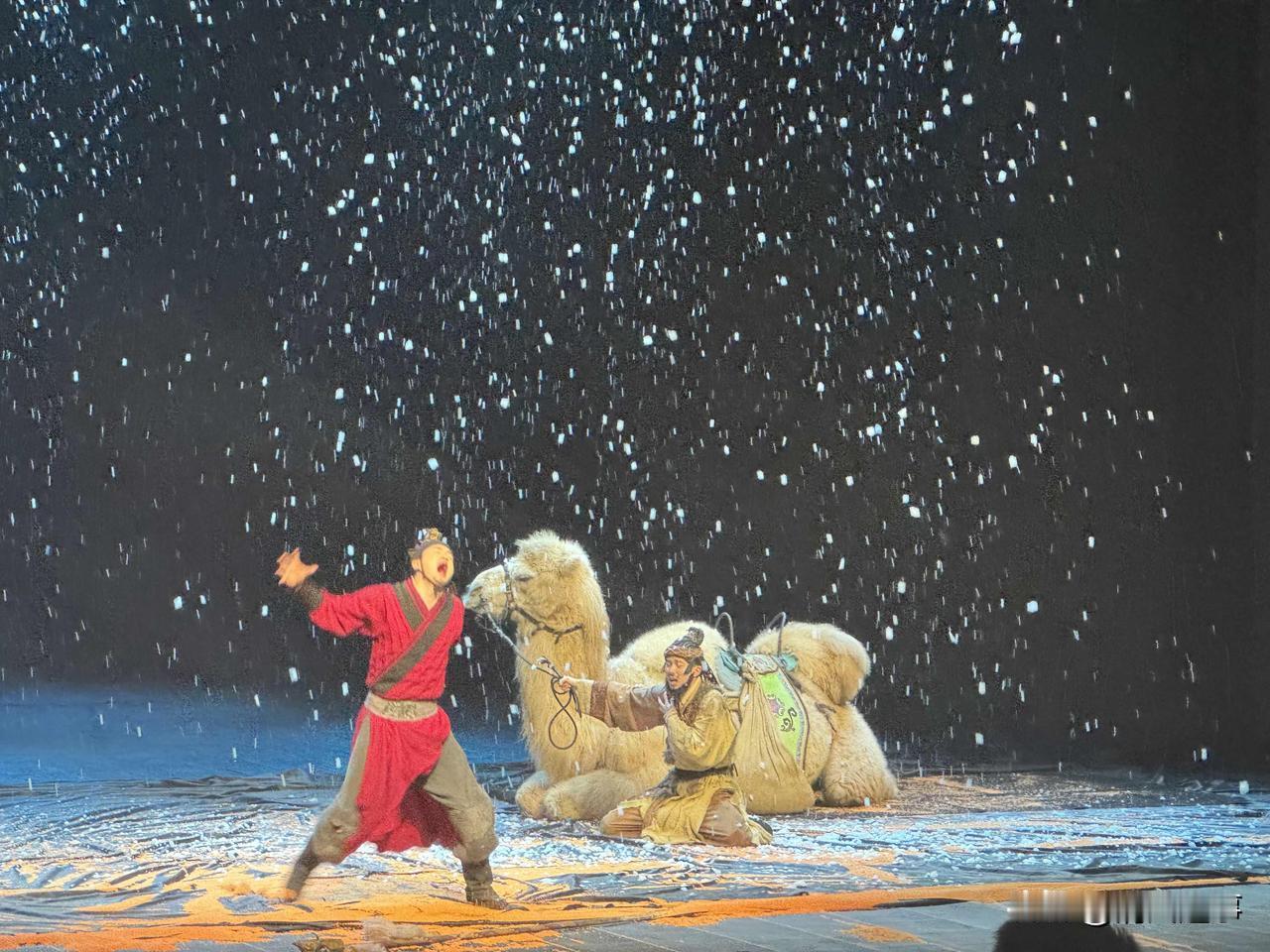 雪落长安,驼铃入梦 看完《驼铃传奇》,满脑子都是漫天飞雪里那抹红衣和卧在雪中的骆驼。演员的肢体语言充满张力,每一个动作都像是在诉说丝路商人的孤勇。 舞台上的雪片簌簌落下,仿佛把千年前的风沙与苦寒都带到了眼前。那一刻突然明白,所谓传奇,从不是惊天动地的神话,而是普通人在绝境里走出来的坚韧。 走出剧场,城市的灯火依旧温暖,但我心里,已经装下了丝路风雪里的那串驼铃。