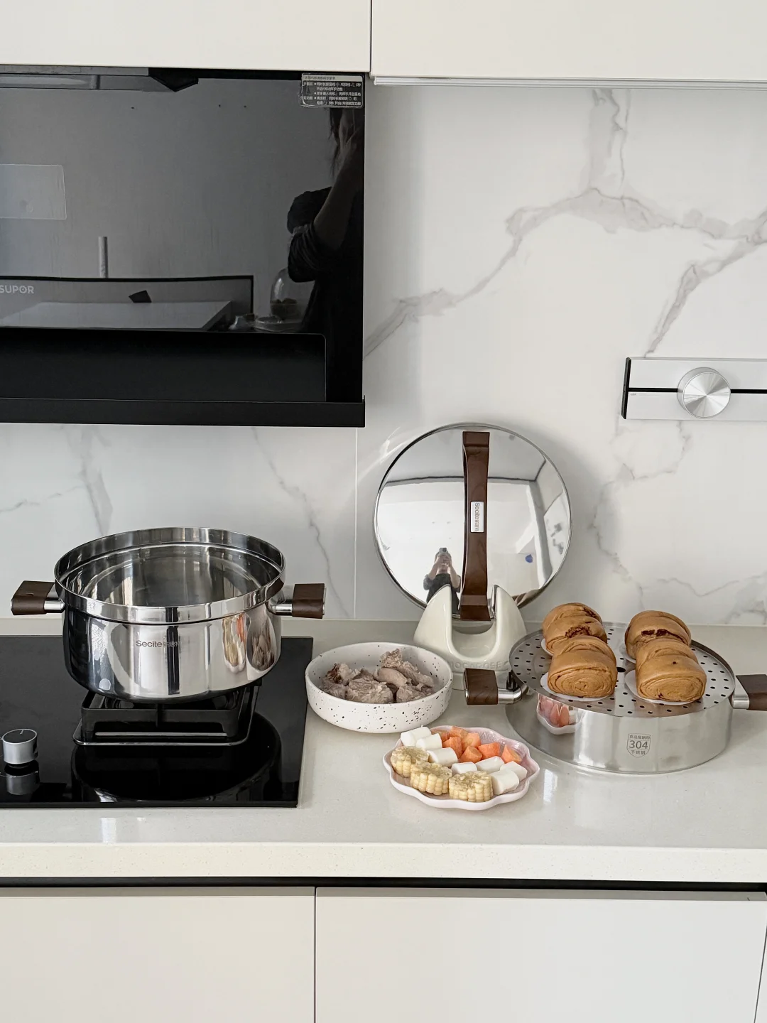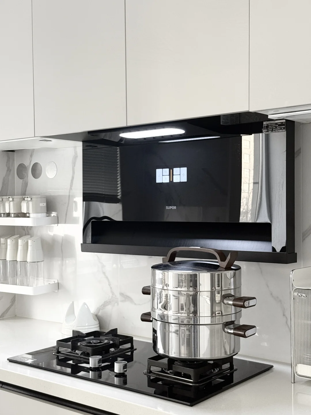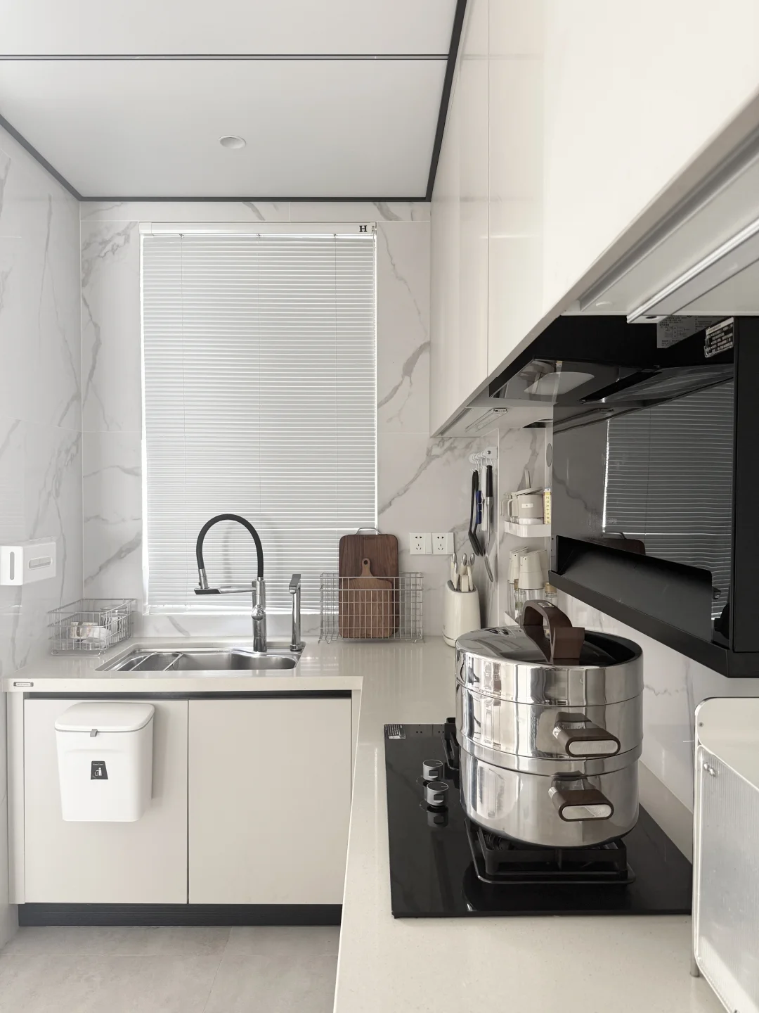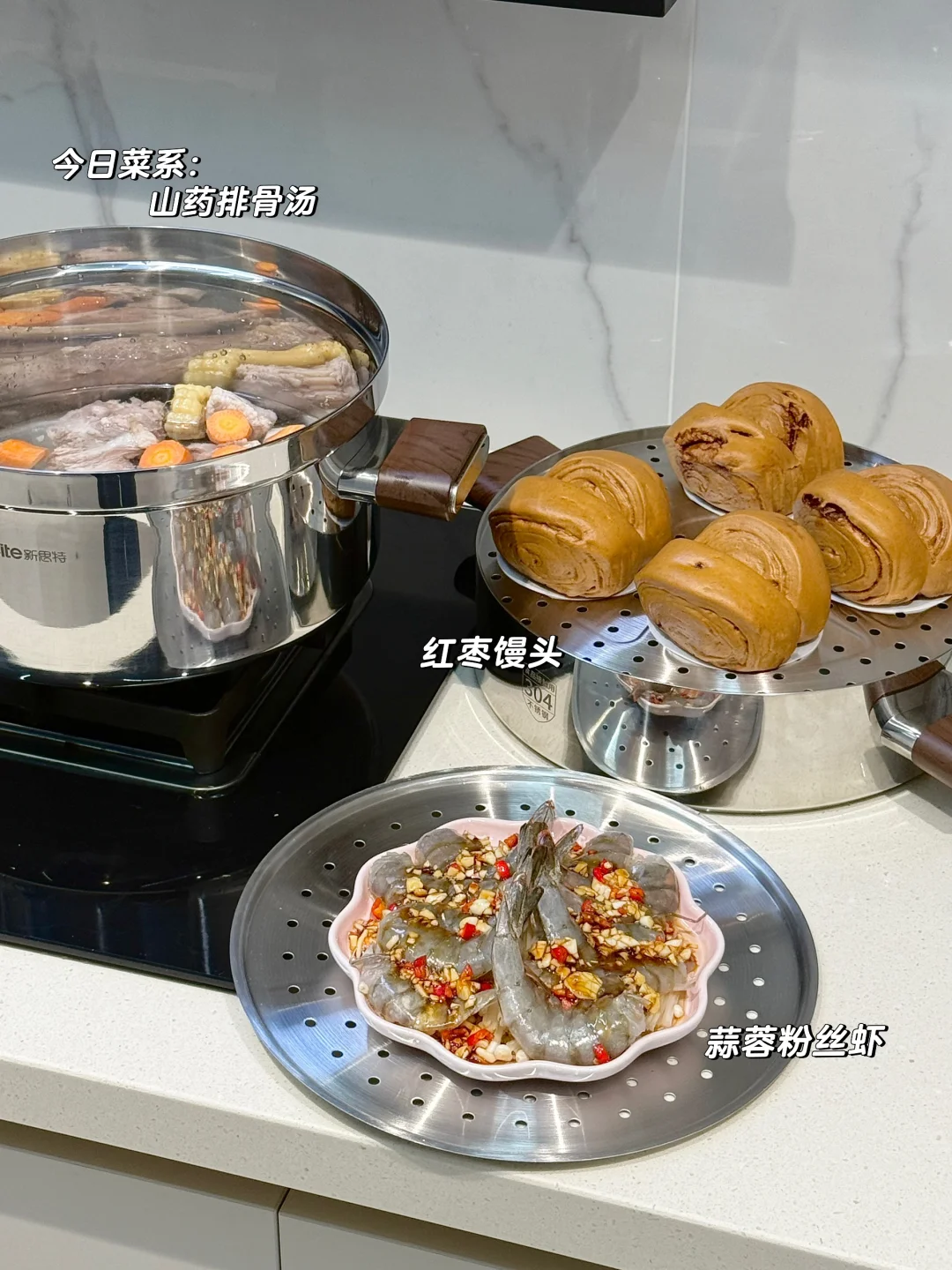 厨房虽然不大 但五脏俱全 浅色系的厨房入住了三年 依旧好看又实用 - 对于牛马打工人来说 下班后快速解决一顿饭有多重要 - 今日菜系:排骨山药汤🥣 红枣馒头🥞 蒜蓉粉丝虾🦐 放进蒸锅 上蒸馒头 下煮汤 一锅直接搞定 我可以美美的看电视等饭菜啦~[捂嘴笑R]