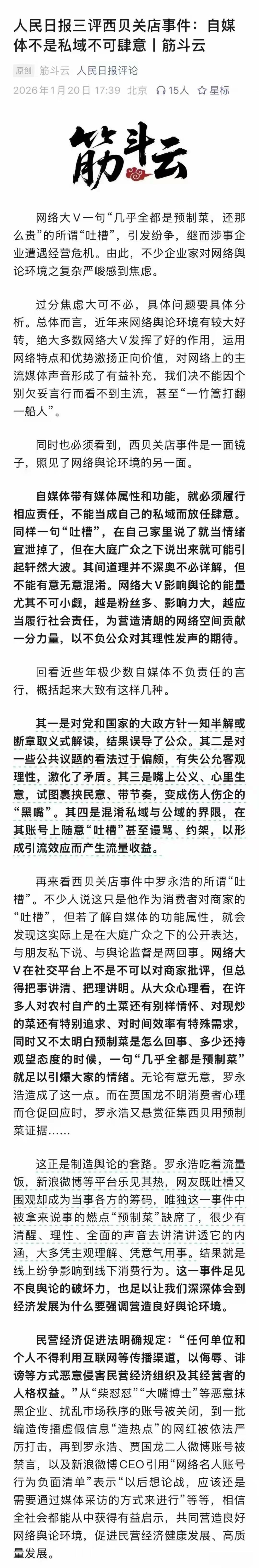 人民日报的这篇评论定性非常清楚,认为在西贝事件中罗永浩吃着流量的饭,新浪平台乐见其热,网民成了被各方利用的筹码。也就是说,认定罗永浩在此事中负有一定的责任,新浪微博也有相应的责任,就看后面如何进行处理了。人民日报的这三篇连续评论,即使指出了各方面存在的问题,也明确了解决办法,而且进行了定性,这也为后续的事情线下处理提供了一定的依据。人民日报的这些评论,相信不仅仅是代表报社,应该也代表了某方面的权威意见。看看后续罗永浩的境况吧,就看能不能全身而退。