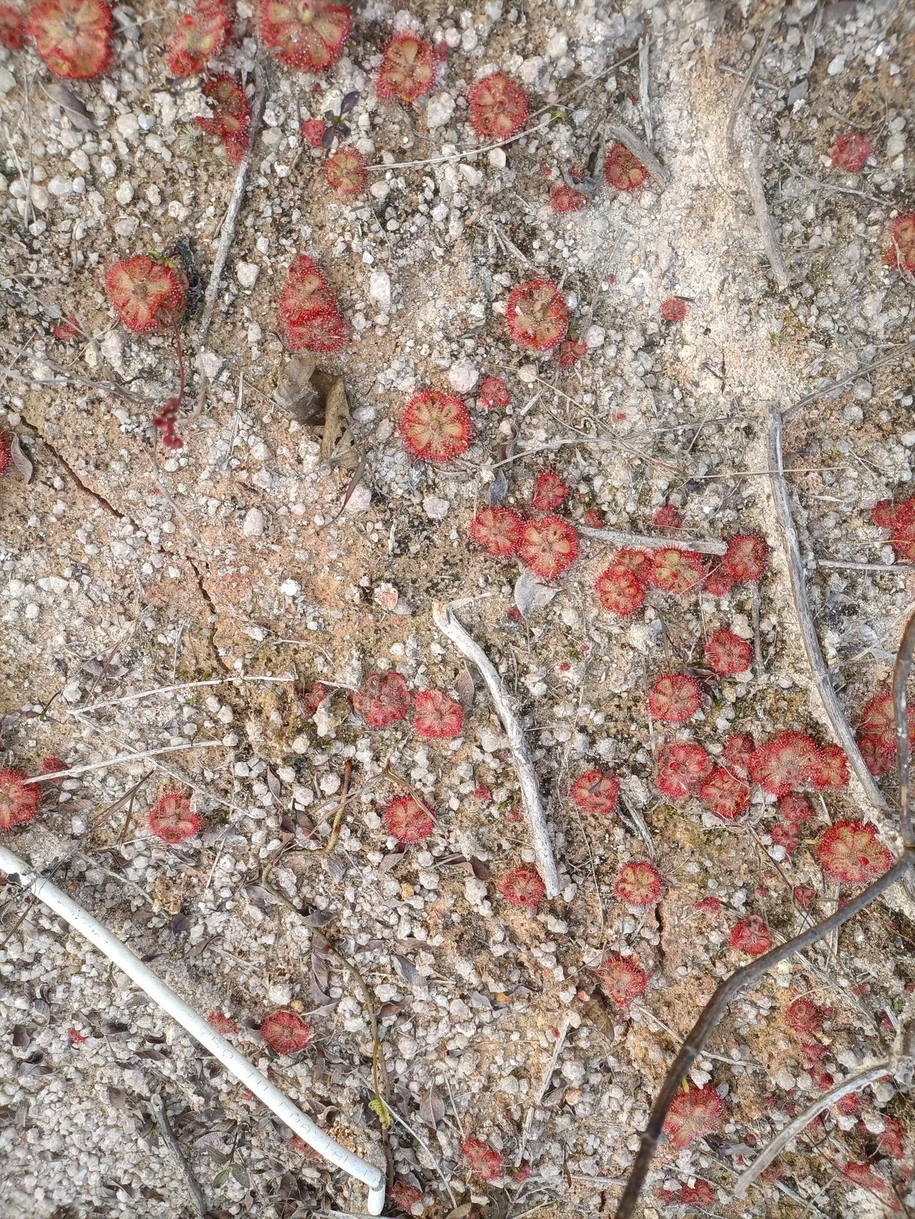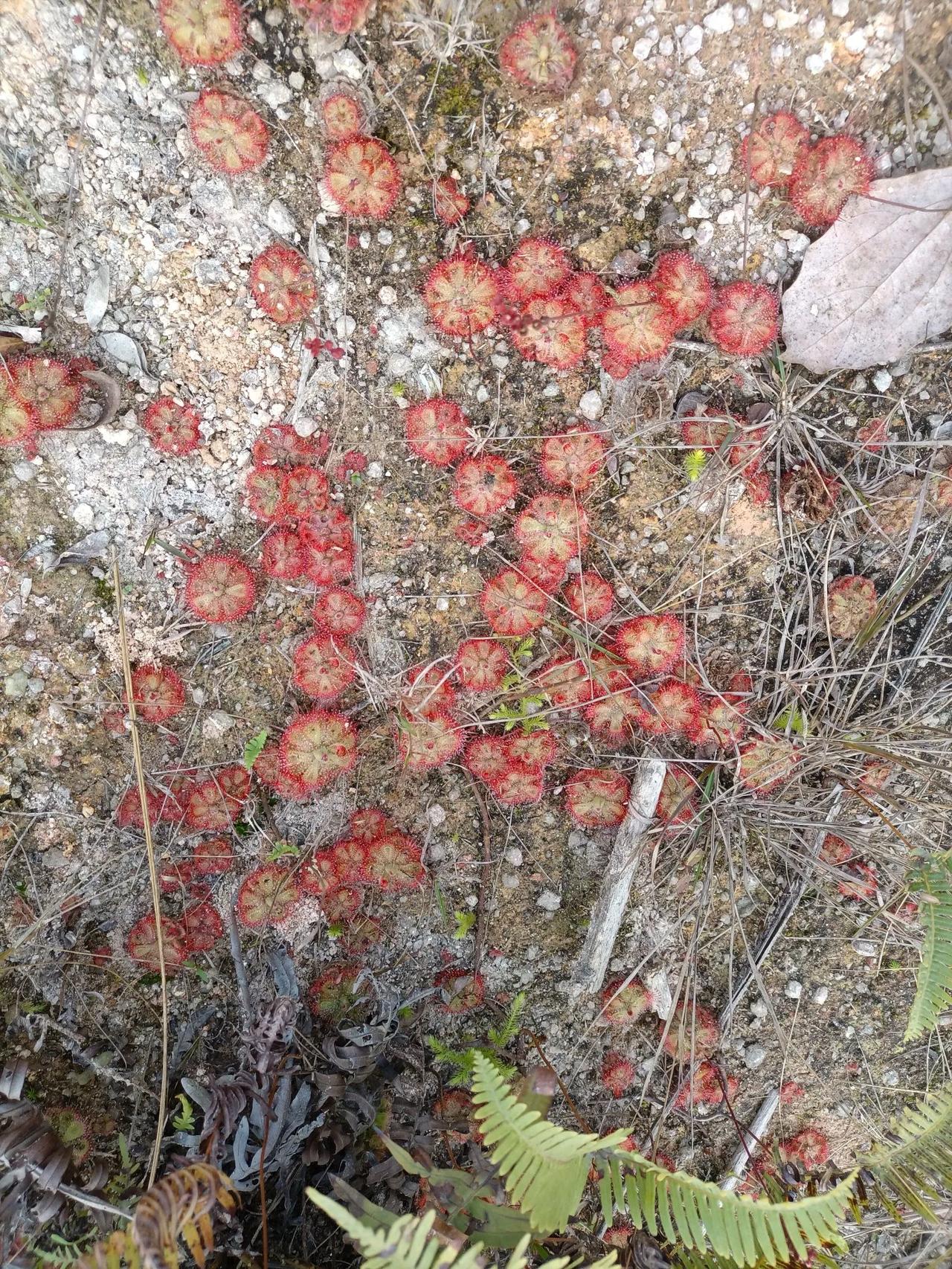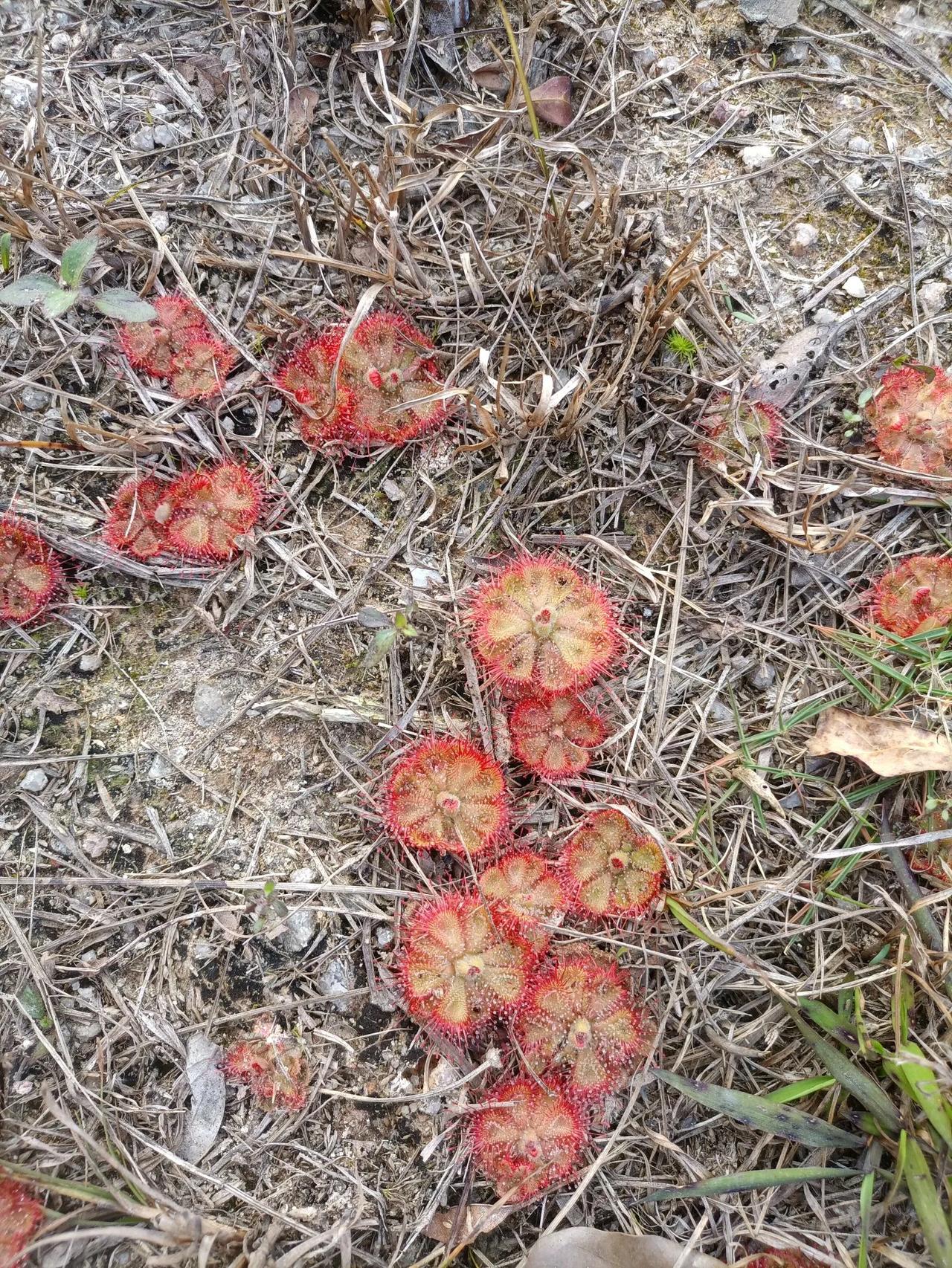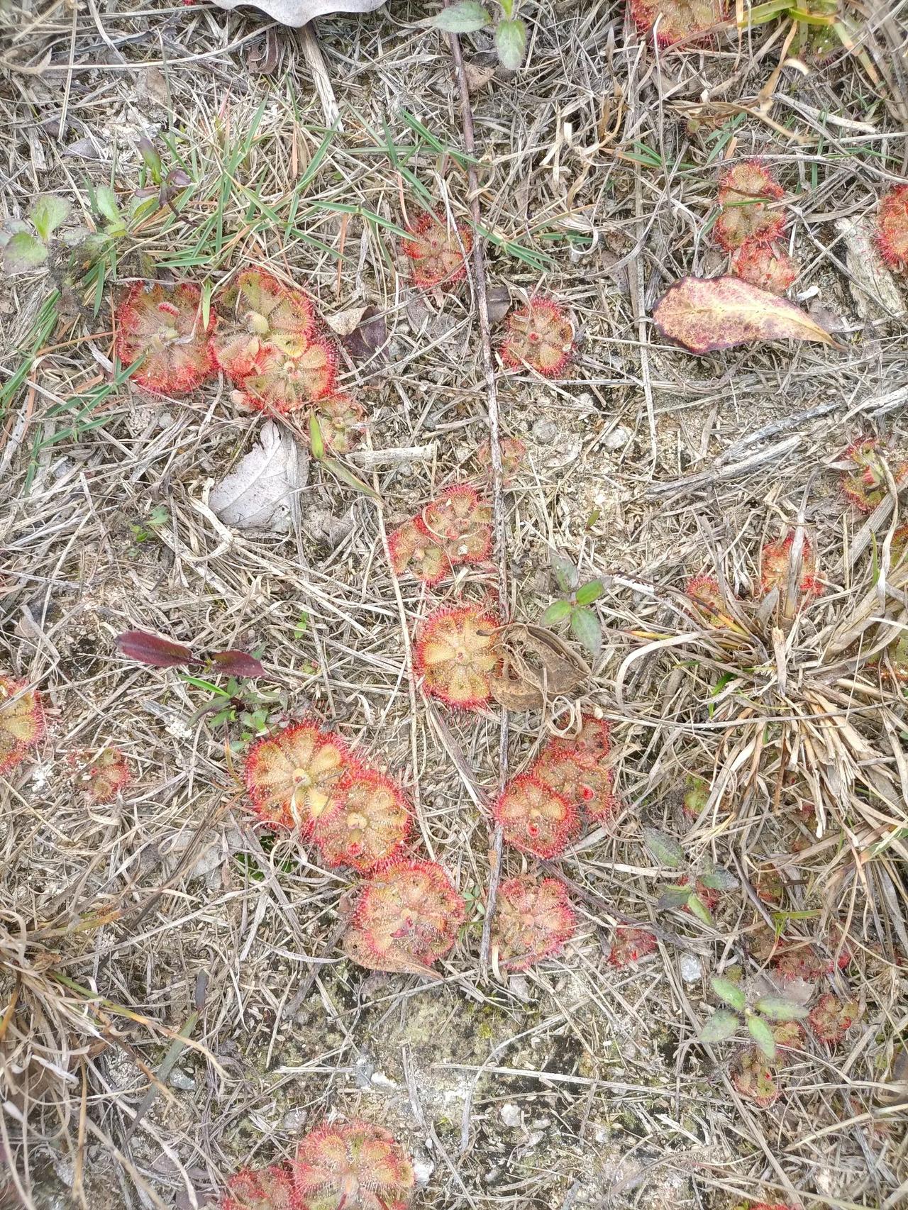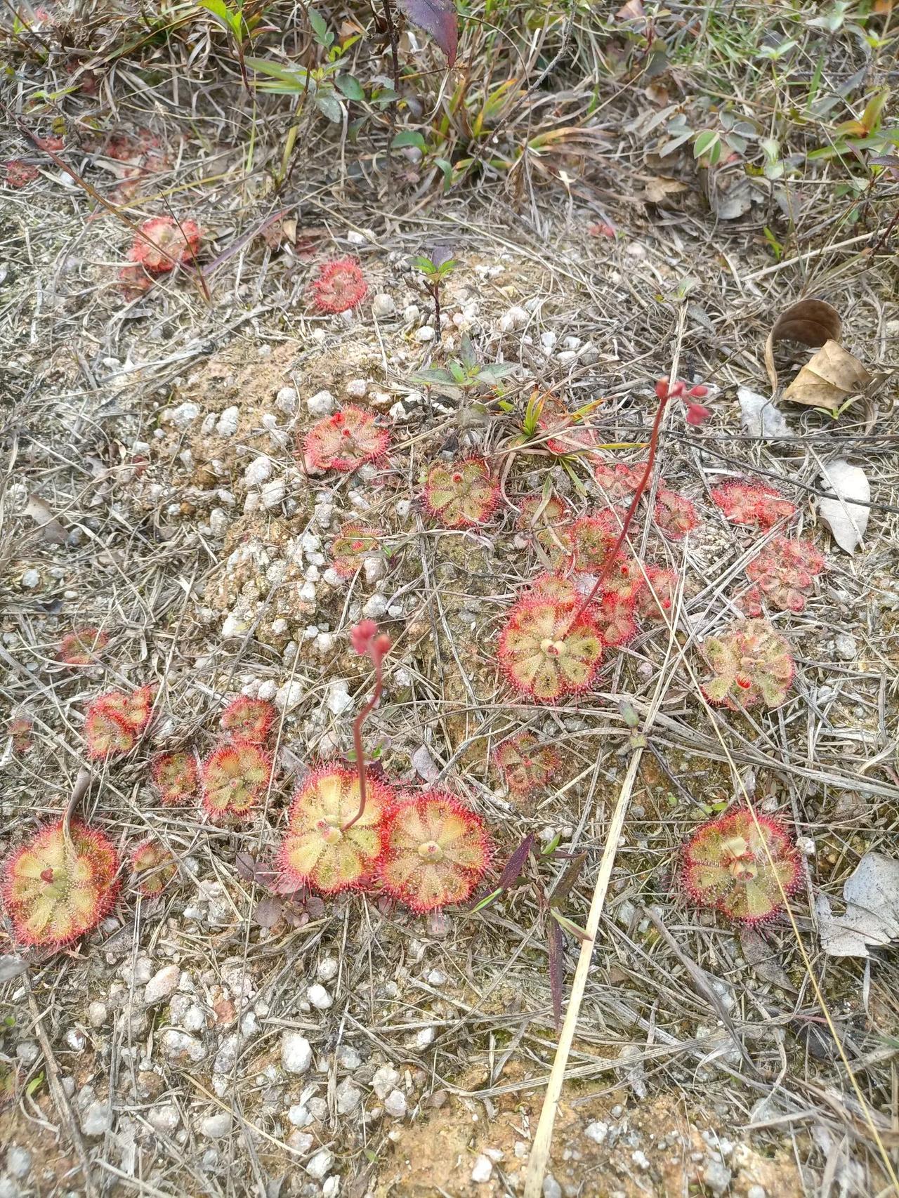 这是什么植物?我不禁发起了疑问。今天去玩,看见荒野上长满了这种形状奇葩的植物,像一个个莲盘一样布满地上,莲盘上粘满了细小的露珠,但是摸起来很黏手,中心抽出纤细的枝条,枝条顶端挂着若干朵似乎是含苞待放的花蕾。它们往往聚集成片,看了都眼花缭乱。