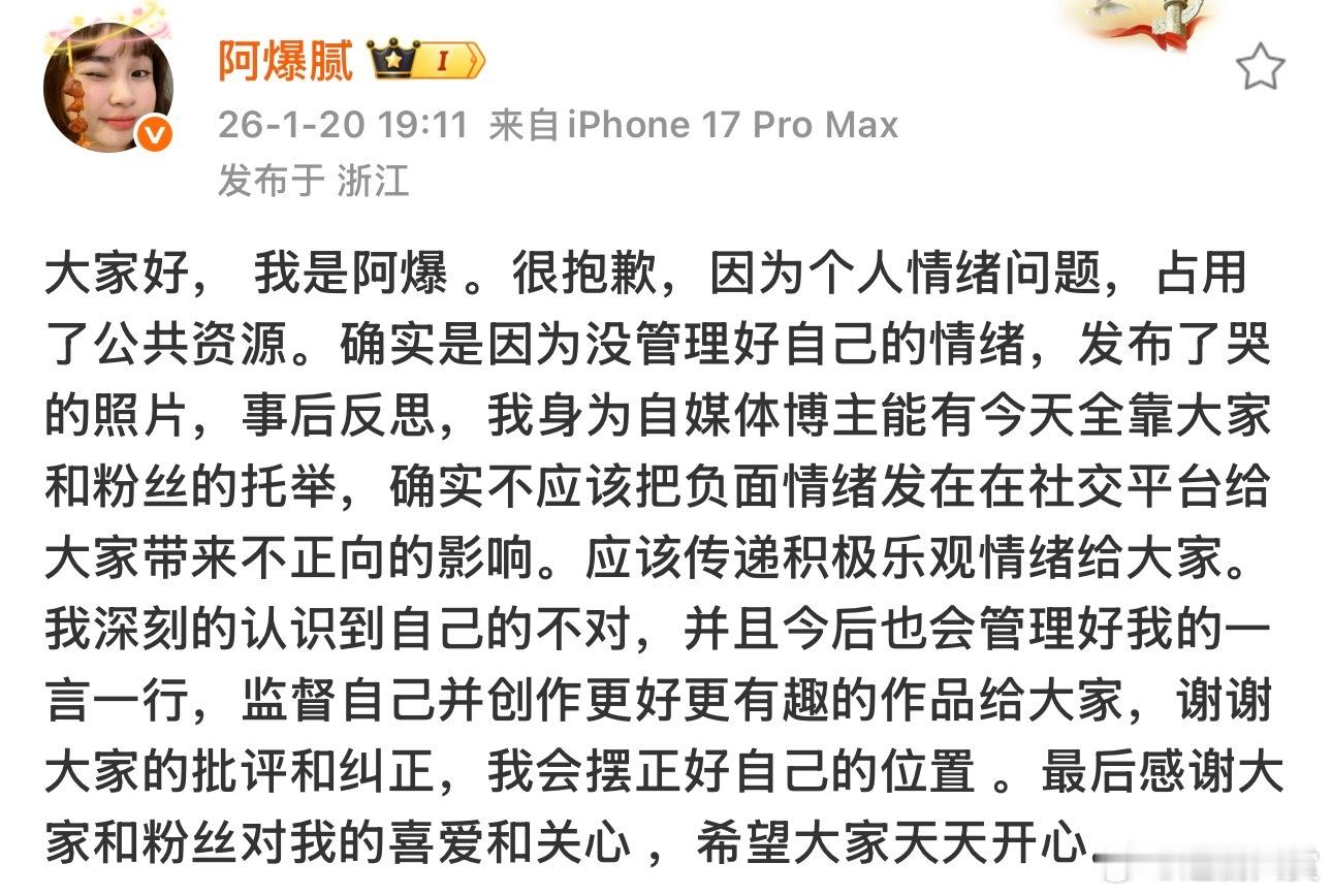 阿爆道歉 阿爆发文道歉了,称自己不应该把负面情绪发泄在个人社交平台,也谢谢大家的批评和纠正,今后会摆正好自己的位置。