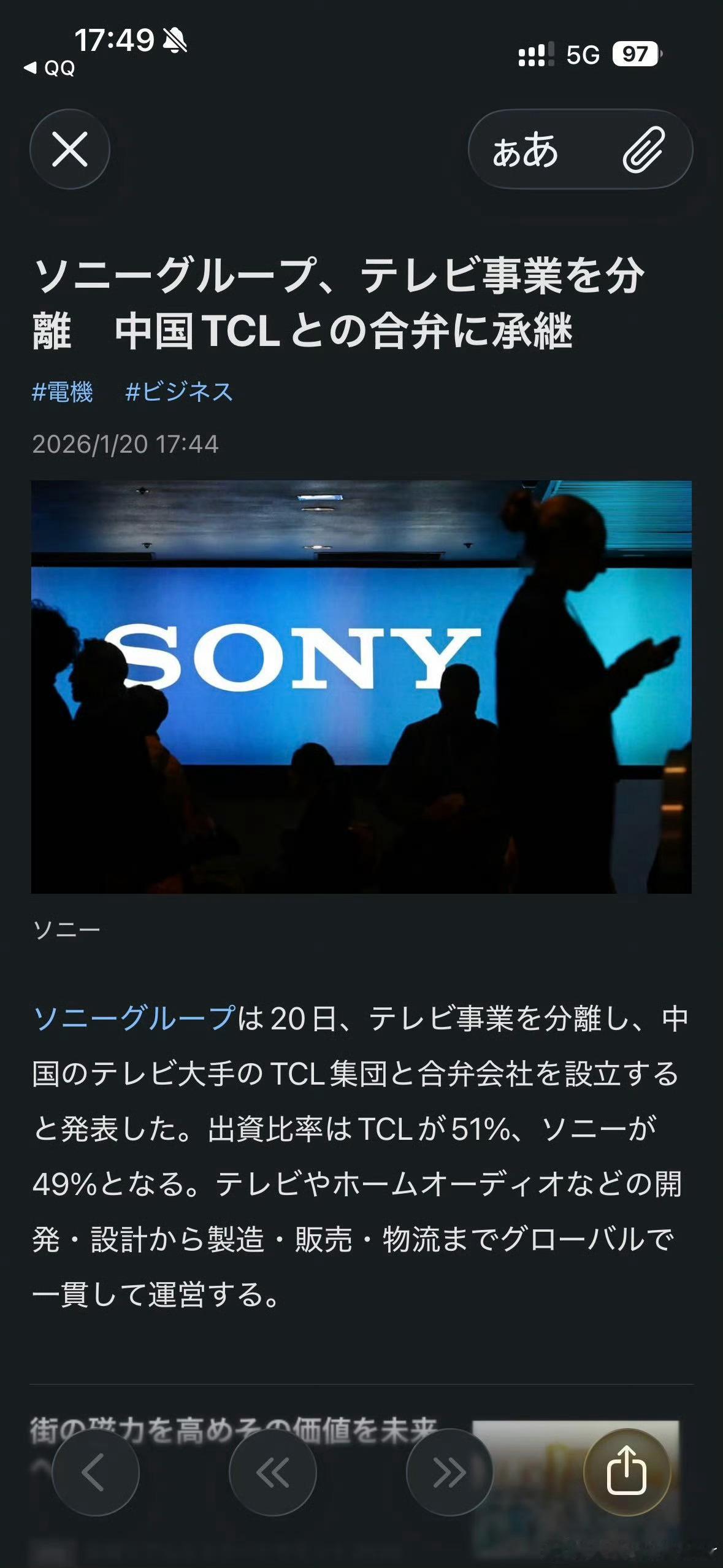 【索尼或剥离电视业务】索尼与TCL成立合资公司 据日本经济新闻报道,索尼集团20日宣布,将剥离电视业务,并计划与中国电视巨头TCL集团成立合资公司。其中TCL出资占比51%,索尼出资49%。新公司将对电视机及家用音响等业务,从研发设计到制造、销售、物流环节实现全球一体化运营。 (Donews) 疑似王鹤棣网传女友去了演唱会
