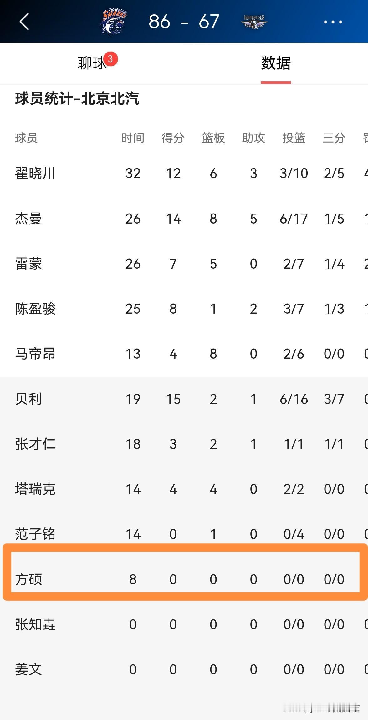 北京北汽老将方硕真是毫无打球欲望!在今天北京北汽客场以67:86惨败于上海久事的比赛中,方硕在攻防两端都显得无精打采,他看起来并没有准备好打球。 整场比赛下来,方硕替补出战8分钟,没有出手怒砍0分0篮板0助攻0抢断0盖帽0犯规,出现了1次失误,他的场上正负值为-9。 作为北京北汽的功勋老将,方硕的比赛态度和翟晓川相比真是差距巨大,如今的方硕完全就是在混吃等死。