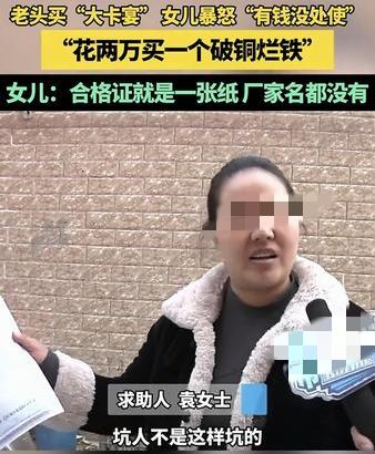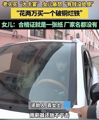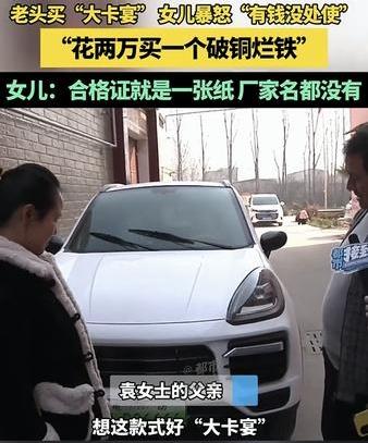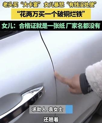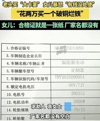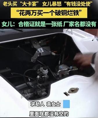 河南,一老人花两万元买了一辆外观类似豪车“卡宴”的电动代步车,这老人女儿发现后,看到车辆不但质量差劲,这合格证上的相关信息也缺失,为女儿大怒,并向媒体求助维权。 原来,老人因为车辆外形酷似“卡宴”,而且价格也便宜还低功耗,便花了两万买了这辆车,但老人女儿看到车子后则气不打一处来,甚至在镜头前生气说老人就是有钱没处使,花两万买个破铜烂铁。 原来这车,不但前牵引盖打开后里面是空的,这门还关不严翘边,就连雨刮器都无法正常放下。而且这辆车的合格证就是一张纸,甚至连生产厂家都没有。 女儿生气的表示,不但是这车质量差没法说,这合格证更是在坑人!目前女儿已向媒体求助,希望解决车辆质量问题及合格证缺失的问题进行维权。 看得出来,老人女儿是很生气啊,但她不是不同意老人买车,她生气的应该是老人没和她提前商量一下,毕竟买车不是一个小事,这两万块钱也不是小数目啊,这要是年轻人给把把关,质量有保障点也安全些吧。 但也有不少网友觉得,买都买了就随便老人吧,起码以后老人出门也能遮风挡雨,还跑不快,比骑电动车啥的安逸又安全多了,况且2万多就不要纠结那么多了… 对此大家怎么看?