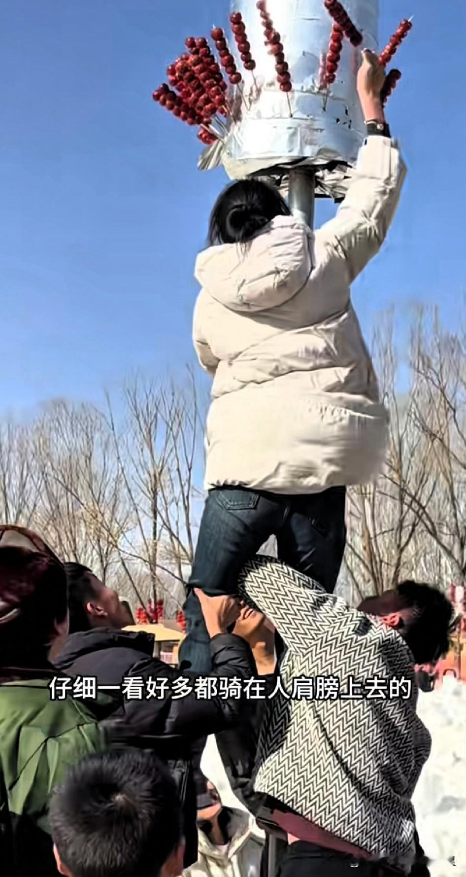 为了一串糖葫芦,这阵仗也太拼了! 家人们谁懂啊!为了薅到免费糖葫芦,直接上演“叠罗汉”名场面!有人蹲在下面当“人肉底座”,有人踩着肩膀往上爬,就为了够到那根大柱子上的糖葫芦串。 这画面又好笑又热血,看得我跟着捏把汗。其实说白了,大家图的不是那串糖葫芦,就是凑个热闹、图个乐呵。 生活里的快乐,有时候就是这么简单又纯粹!