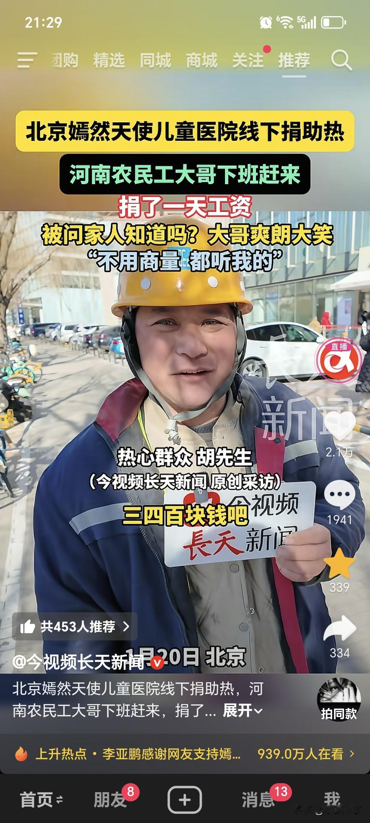 泪目了[流泪]!1月20号,一位河南大哥,刚从工地下班,头戴黄色安全帽,就直奔北京嫣然儿童天使医院,不是带孩子来看病,而是拿出了一天的工资300-400元,进行捐款,希望李亚鹏渡过难关。说实话,黄色帽子在工地上代表一线最普通的工人,又冷又累,一天下来真是不容易, 通过照片看,连个棉衣都不舍得给自己买,还穿着单薄的外套。记者随后问:你捐款这件事家里知道吗?大哥回答说:不用商量,都听我的。从对话中,也能看出,整个家庭里面有乐于助人的好风气。除此以外,大哥之所以捐款,还有一点,李亚鹏虽然出生在新疆乌鲁木齐,其实祖籍是河南平顶山,两人属于老乡[泣不成声]。